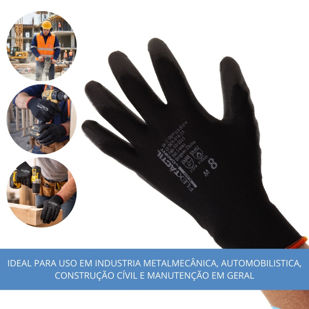 KIT 3 PARES LUVA FLEXTATIL PRETA Luva PU Preta Flextáctil, desenvolvida para oferecer proteção, conforto e alta sensibilidade ao toque. Confeccionada em nylon com revestimento em poliuretano (PU) na palma e nos dedos, permite excelente aderência e manuseio preciso, inclusive de peças úmidas. Possui formato anatômico e punho elástico, garantindo ajuste firme, conforto e reduzindo a fadiga mesmo em longos períodos de uso. Indicada para atividades que exigem proteção antiestática (dissipativa), sem comprometer o tato. Ideal para uso na indústria metalomecânica, automobilística, construção civil, manutenção em geral e outras atividades profissionais.