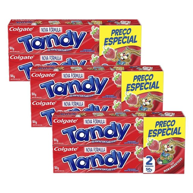 O Kit Contém: 3 Pack Creme Dental Infantil Colgate Tandy Morango com 2 unidades de 50 gramas cada. A pasta de dente infantil Colgate Tandy foi desenvolvida especialmente para crianças e oferece proteção anticárie. Sua fórmula clinicamente comprovada, contém flúor ativo e baixa abrasividade que fortalece o esmalte dos dentes deixando-os fortes e saudáveis. O delicioso sabor suave de morango agrada as crianças e deixa seu filho com um hálito refrescante Benefícios: Contém 1110ppm de flúor ativo, que ajuda a proteger os dentinhos das crianças das cáries. Sua fórmula ajuda a proteger o esmalte dos dentes, porque possui baixa abrasividade O delicioso sabor de morango agrada as crianças e ajuda a criar o hábito da escovação O interior da embalagem contém atividades para entreter as crianças, deixando a hora da escovação mais divertida Não contém açúcar