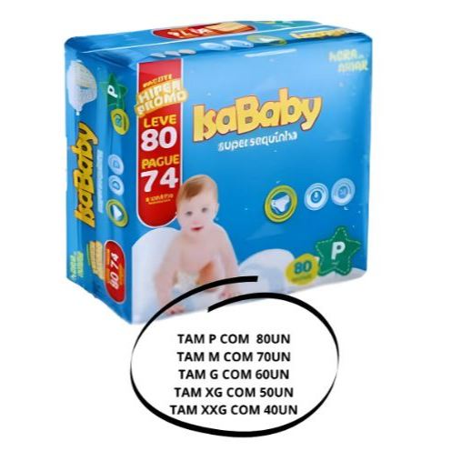 Fralda infantil Isababy Super Sequinha Pacotão econômico Tamanhos P - 3 a 8kg M - 5 a 10kg G - 10 a 13kg XG - 13 a 15kg XXG - 15 a 25kg Especificações - Alta absorção, - Até 12h sem troca, - Fecho ajustável, - Formato anatômico, - Gel super absorvente - Hipoalergênico. ATENÇÃO!!! TIRE SUAS DÚVIDAS PELO CHAT ANTES DE REALIZAR SUA COMPRA.