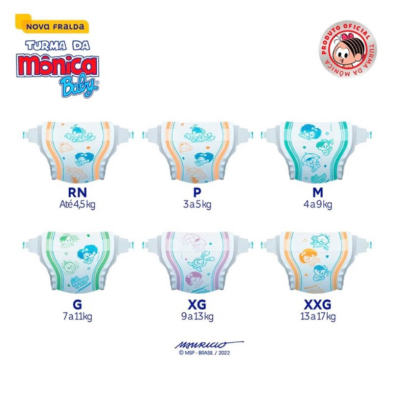 Validade 08/2027 A Turma da Mônica Baby uniu proteção e conforto em uma nova opção de fralda, para garantir que seu bebê cresça feliz e tenha as melhores lembranças da sua infância. A Nova fralda Turma da Mônica Baby possui a nova Tecnologia QuatroSec para que ele fique calmo, tranquilo e seguro durante o dia e a noite toda. Conta com um exclusivo sistema de canais que distribui mais rápido o xixi, barreiras anti-vazamento e uma fina camada extra que ajuda a manter o bebê sequinho por até 12 horas, além de cintura elástica que proporciona um perfeito ajuste no corpinho. Até 4,5kg