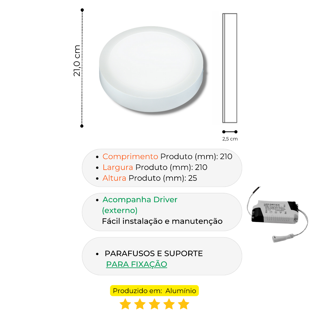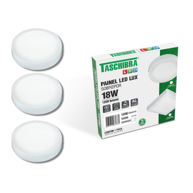 ***** KIT COM 3 UNIDADES ***** PAINEL LED 18W LUX REDONDO SOBREPOR TASCHIBRA *****6500K OU 4000K OU 3000K***** MAIS DE 10 ANOS NO MERCADO! Distribuidor Autorizado SpaceON Ecommerce Produto de Qualidade, Original na Caixa com GARANTIA! Enviamos o seu pedido IMEDIATAMENTE após a confirmação do pagamento. ENVIO MAIS RÁPIDO DO BRASIL. COMPRE CONOSCO! Suporte 24 horas. ----------------------------- CARACTERÍSTICAS ----------------------------- Os painéis LED REDONDOS de SPOBREPOR foram desenhados com conceito ultrafino e alto-brilho, com aparência sucinta e prática. Possuem quadro de liga de alumínio, proporcionando firmeza e alta dissipação de calor, além de um principio óptico avançado para conduzir a luz com uniformidade, suavidade e alto índice de eficiência luminosa. São versáteis, pois atendem a variações de tensões entre 100V e 240V. Ideais para utilização em ambientes internos e/ou abrigados, como iluminação decorativa e/ou principal, tais como garagens, escritórios, oficinas, cozinhas, dormitórios, salas de estar e jantar etc. - Esta é um produto autovolt (100-240v), permitindo que o mesmo seja aplicado tanto em 127v como em 220v. ------------------------------------------- ESPECIFICAÇÕES TÉCNICAS ------------------------------------------- Uso: Interno Voltagem (V): AUTOVOLT (100-240) Funciona em ambas voltagens 110-220 Frequência (Hz): 50/60 Fator de Potência (FP): 0,5 Potência Máxima (W): 18 Fluxo Luminoso (lm): 1260 Lumens/Watts: 70 Ângulo de Abertura (º): 120 Temperatura de Cor (K): 6500K OU 4000K OU 3000K Dimerizável: Não Índice de Proteção (IP): 20 Garantia: 1 ano Vida Útil (h): 20000 Produzido em: Alumínio Fonte de Alimentação: Elétrica Comprimento Produto (mm): 210 Largura Produto (mm): 210 Altura Produto (mm): 26 ---------------------------------------------------------------