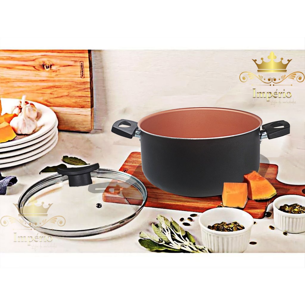 Prazer, somos a “Mimo Variedades”. Confira nossa loja, temos outros modelos, tamanhos e promoções A Arte de Misturas Sabores... Para inspirar... criatividade na hora cozinhar. Sua cozinha equipada com utensílios que facilitam o dia a dia. Beleza, elegância e charme, você vai se apaixonar por essa linda Caçarola com design moderno, além de versátil e funcional! Kit 03 Peças, Panelas Caçarolas Plus 16 18 e 20 cm de diâmetro, acompanha Tampa de Vidro Temperado com saída de vapor e borda de aço inox. O diferencial desse item está em seu material, alumínio de alta qualidade com espessura de 1,1 mm, que confere ao item uma estrutura resistente garantindo a durabilidade e distribuição eficiente do calor, proporcionando o cozimento mais rápido e uniforme dos alimentos. Revestido com 5 camadas de Antiaderente TEFLON (DuPont) - PFOA Free, internamente e externamente, evitando que o alimento grude na superfície, o que possibilita o preparo dos alimentos com menos gordura, além de proporcionar praticidade no momento da limpeza. Cabo reforçado ergonômico, feito em baquelite, material antitérmico que não retém calor. Especificações Técnicas: Descrição / conteúdo: Dimensões aproximadas - cm: (A x L x C - Capacidade volume): - 1 Caçarola 16 cm de diâmetro c/ tampa de vidro – 7 x 16 x 28 – 1,2 L - 1 Caçarola 18 cm de diâmetro c/ tampa de vidro – 8 x 18 x 30 – 1,8 L - 1 Caçarola 20 cm de diâmetro c/ tampa de vidro – 9 x 20 x 32 – 2,5 L Material: Alumínio Revestido Revestimento Externo: Antiaderente – Cor: Preto Revestimento Interno: Antiaderente – Cor: Cobre Espessura Material: 1,1mm Alça: Baquelite Tampa: Tampa de Vidro Temperado Peso Conjunto: 2000 kg Dimensões aproximadas da embalagem (AxLxC): 25 x 35 x 35 cm Peso Embalagem - Caixa Parda: 148 g Recomendações: Antes do primeiro uso é necessário realizar a limpeza e a cura do item, imprescindível para durabilidade e proteção da camada antiaderente. Lave com esponja macia e detergente neutro, seque-a com um pano limpo. Unte a parte interna com óleo ou outra gordura e leve-a ao fogo baixo por 2 minuto. Deixe-a esfriar, lave, enxugue e está pronta para utilizar. Cuidados: - Para conservação e durabilidade do seu produto lavar somente om lado macio da esponja; - Evite a imersão do produto quente em água fria. Sempre o deixe esfriar antes de lavar; - Para mexer os alimentos use somente utensílios de silicone ou nylon; - Não exponha as alças e cabos diretamente ao fogo ou fonte de calor prolongado; - Não pode ser levada ao forno e/ou microondas; - Mantenha o produto sobre a chama do fogão apenas o necessário para o cozimento, sempre em fogo baixo ou médio (nunca superior a 350°C). Detalhes: - Garantia 30 dias contra defeitos de fabricação. - Itens decorativos não acompanham o produto. Imagens meramente ilustrativas - Para descarte dos produtos e embalagens siga as orientações de reciclagem vigente. Estamos à disposição para qualquer dúvida. Agradecemos a sua visita e aguardamos seu pedido!