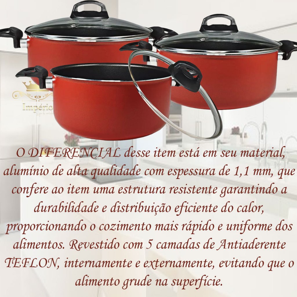 Prazer, somos a “Imperio Variedades”. Confira nossa loja, temos outros modelos, tamanhos e promoções A Arte de Misturas Sabores... Para inspirar... criatividade na hora cozinhar. Sua cozinha equipada com utensílios que facilitam o dia a dia. Beleza, elegância e charme, você vai se apaixonar por essa linda Caçarola com design moderno, além de versátil e funcional! Kit 03 Peças, Panelas Caçarolas Plus 16 18 e 20 cm de diâmetro, acompanha Tampa de Vidro Temperado com saída de vapor e borda de aço inox. O diferencial desse item está em seu material, alumínio de alta qualidade com espessura de 1,1 mm, que confere ao item uma estrutura resistente garantindo a durabilidade e distribuição eficiente do calor, proporcionando o cozimento mais rápido e uniforme dos alimentos. Revestido com 5 camadas de Antiaderente TEFLON (DuPont) - PFOA Free, internamente e externamente, evitando que o alimento grude na superfície, o que possibilita o preparo dos alimentos com menos gordura, além de proporcionar praticidade no momento da limpeza. Cabo reforçado ergonômico, feito em baquelite, material antitérmico que não retém calor. Especificações Técnicas: Descrição / conteúdo: Dimensões aproximadas - cm: (A x L x C - Capacidade volume): - 1 Caçarola 16 cm de diâmetro c/ tampa de vidro – 7 x 16 x 28 – 1,2 L - 1 Caçarola 18 cm de diâmetro c/ tampa de vidro – 8 x 18 x 30 – 1,8 L - 1 Caçarola 20 cm de diâmetro c/ tampa de vidro – 9 x 20 x 32 – 2,5 L Material: Alumínio Revestido Revestimento Externo: Antiaderente – Cor: Vermelha Revestimento Interno: Antiaderente – Cor: Preta Espessura Material: 1,1mm Alça: Baquelite Tampa: Tampa de Vidro Temperado Peso Conjunto: 2000 kg Dimensões aproximadas da embalagem (AxLxC): 25 x 35 x 35 cm Peso Embalagem - Caixa Parda: 148 g Recomendações: Antes do primeiro uso é necessário realizar a limpeza e a cura do item, imprescindível para durabilidade e proteção da camada antiaderente. Lave com esponja macia e detergente neutro, seque-a com um pano limpo. Unte a parte interna com óleo ou outra gordura e leve-a ao fogo baixo por 2 minuto. Deixe-a esfriar, lave, enxugue e está pronta para utilizar. Cuidados: - Para conservação e durabilidade do seu produto lavar somente om lado macio da esponja; - Evite a imersão do produto quente em água fria. Sempre o deixe esfriar antes de lavar; - Para mexer os alimentos use somente utensílios de silicone ou nylon; - Não exponha as alças e cabos diretamente ao fogo ou fonte de calor prolongado; - Não pode ser levada ao forno e/ou microondas; - Mantenha o produto sobre a chama do fogão apenas o necessário para o cozimento, sempre em fogo baixo ou médio (nunca superior a 350°C). Detalhes: - Garantia 30 dias contra defeitos de fabricação. - Itens decorativos não acompanham o produto. Imagens meramente ilustrativas - Para descarte dos produtos e embalagens siga as orientações de reciclagem vigente. Estamos à disposição para qualquer dúvida. Agradecemos a sua visita e aguardamos seu pedido!