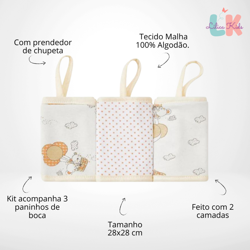 Kit 3 Paninhos de Boca Babete Estampado com Prendedor 28cm x 28cm