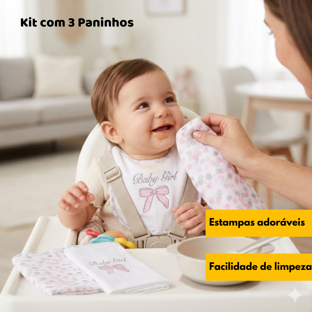 Kit 3 Panos de Boca Bebe Com Prendedor de Chupeta 38 x 38cm Fralda Babete 100% Algodão Papi Bordado Fraldinha