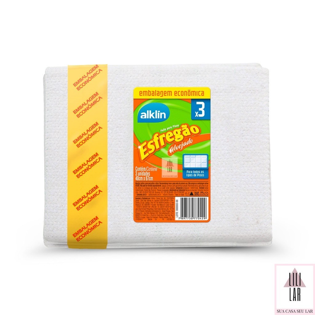 Pano de Chão Esfregão Alvejado com 3 unidades, Os panos para piso Alklin unem maciez e resistência, garantindo eficiência na hora da limpeza. Ideal para todos os tipos de pisos, Muito macio e durável. Alto poder de absorção. Produzido com fibras diversas. Embalagem econômica com 3 und. Ideal para ser utilizado em cozinhas e copas. ESPECIFICAÇÕES: - Contém: 1 Kit com 3 Panos para de Chão Esfregão Alvejado - Tamanho: 40cm x 67cm - Modelo: Esfregão Alvejado c/ 3und. - Origem: Brasil - Fabricante: Alklin Avisos •As cores do produto podem sofrer alterações conforme o monitor ou tela do celular e conforme o lote do produto. •Medidas e peso podem sofrer uma pequena variação a depender do lote do fabricante. *Imagens Ilustrativas. Qualquer dúvida nos procure. Boas Compras!