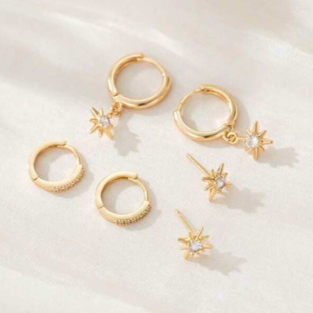 Kit 3 pares de brincos elegantes femininos em formato de estrela, em prata 925, com zircônias e banho de ouro 18K