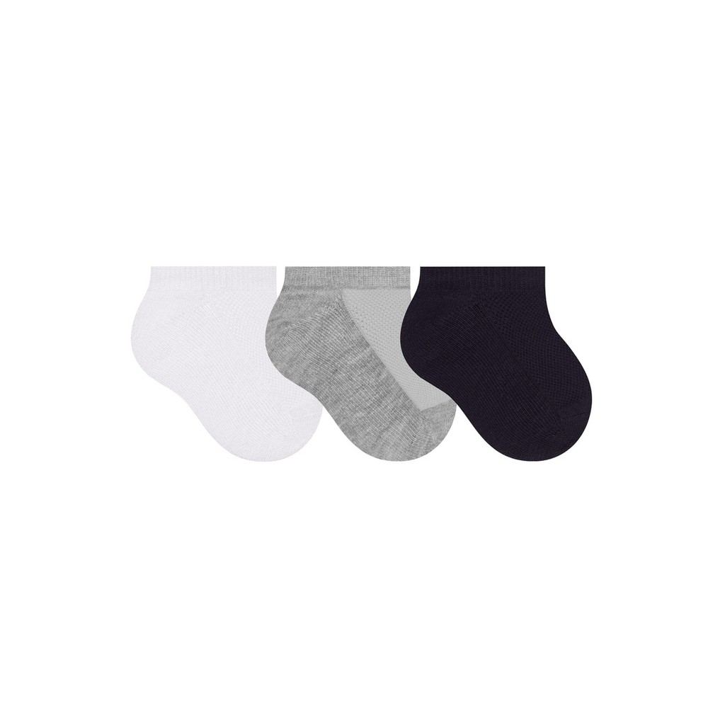 Características: Kit 3 Pares de Meias Bebê Calcanhar verdadeiro Punho macio e confortável Ajuste perfeito Cano: Invisível Composição: Na cor 998/Branco 51% Algodão, 44% Poliamida, 03% Elastano e 02% Outra Fibra Na cor 999/Branco/Cinza Mescla/Preto Cinza Mescla: 45% Algodão, 44% Poliamida, 08% Poliéster e 03% Elastano Demais cores: 51% Algodão, 44% Poliamida, 03% Elastano e 02% Outra fibra