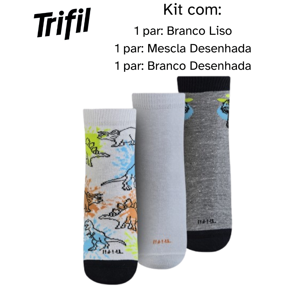 Kit 3 Pares de Meias Infantil Trifil – Conforto e Estilo com Estampa Divertida - Dinossauros Bordados