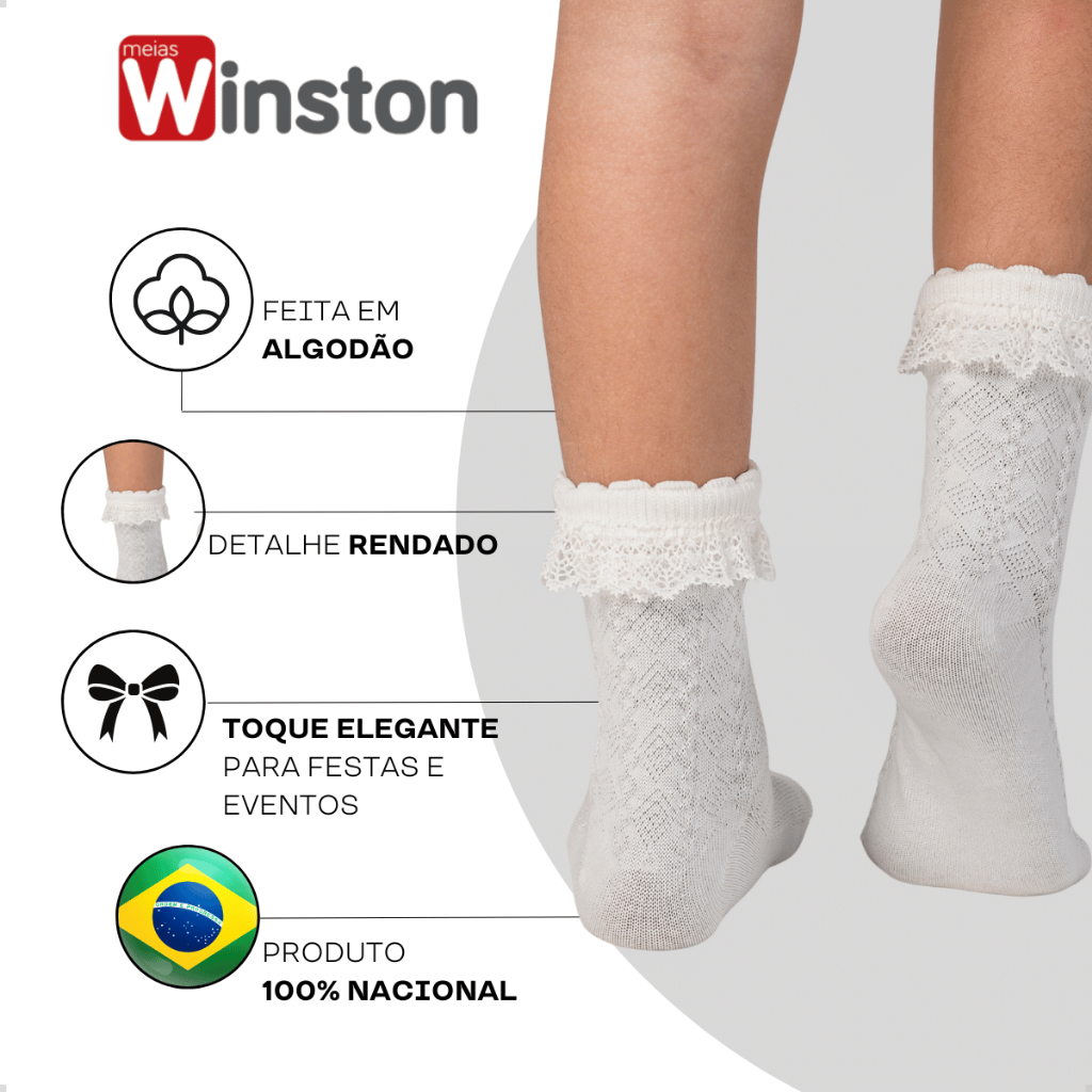 O Kit 3 Pares de Meias Bebê Menina Rendada Winston é a escolha ideal para quem busca um toque de sofisticação e charme no visual da pequena. Com delicados detalhes de renda, essas meias transformam qualquer ocasião especial, como batizados, festas e outros momentos marcantes, em um verdadeiro conto de fadas. Benefícios: Toque de Elegância: As meias com babado de renda oferecem um estilo delicado e encantador, perfeito para eventos formais e momentos inesquecíveis. Conforto Garantido: Feitas com 65% de algodão, essas meias são supermacias, garantindo que os pezinhos fiquem confortáveis o dia todo. Ajuste Perfeito: O elastano proporciona um ajuste flexível e confortável, permitindo que o bebê se movimente livremente Versatilidade: O design elegante e as cores suaves tornam essas meias perfeitas para batizados, festas de aniversário e outras ocasiões especiais. Tamanhos Disponíveis: 0 a 12 meses Composição: Algodão 65%: Proporciona um toque suave e aconchegante, ideal para a pele sensível dos bebês. Poliamida 31%: Garante resistência e rápida secagem, mantendo as meias sempre secas e confortáveis. Elastano 4%: Oferece elasticidade, garantindo flexibilidade e um ajuste perfeito. Características: Renda delicada: Um toque de sofisticação e charme para ocasiões especiais. Cano Médio: Oferece conforto e proteção extra para o tornozelo e pé do bebê. Ideal para eventos especiais: Perfeitas para batizados, festas e momentos inesquecíveis. Sobre a Winston: Com 56 anos de tradição, a Winston é uma marca 100% nacional conhecida por sua qualidade e compromisso em oferecer produtos duráveis e confortáveis. Com nossa experiência e dedicação, buscamos sempre o melhor para sua família, para que cada momento seja inesquecível e cheio de conforto