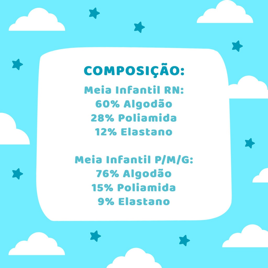 Kit 3 Pares Meia Infantil Baby 02025 Cano Médio As meias infantil UP 02025 são feitas em algodão e são super confortáveis para as crianças. Possui cano médio e são ótimas para serem usadas em dias mais frios, por absorverem o calor e manter os pés mais aquecidos Meia com calcanhar verdadeiro e punho soft proporcionando maior conforto aos seus pés. Composição: Meia RN: 60% algodão, 28% Poliamida, 12% Elastano Outros tamanhos: 76% Algodão, 15% Poliamida e 9% Elastano Tamanhos: - RN - 16-19 - 20-23 - 24-27 - 28-31 Tem alguma dúvida? Nos faça uma pergunta!