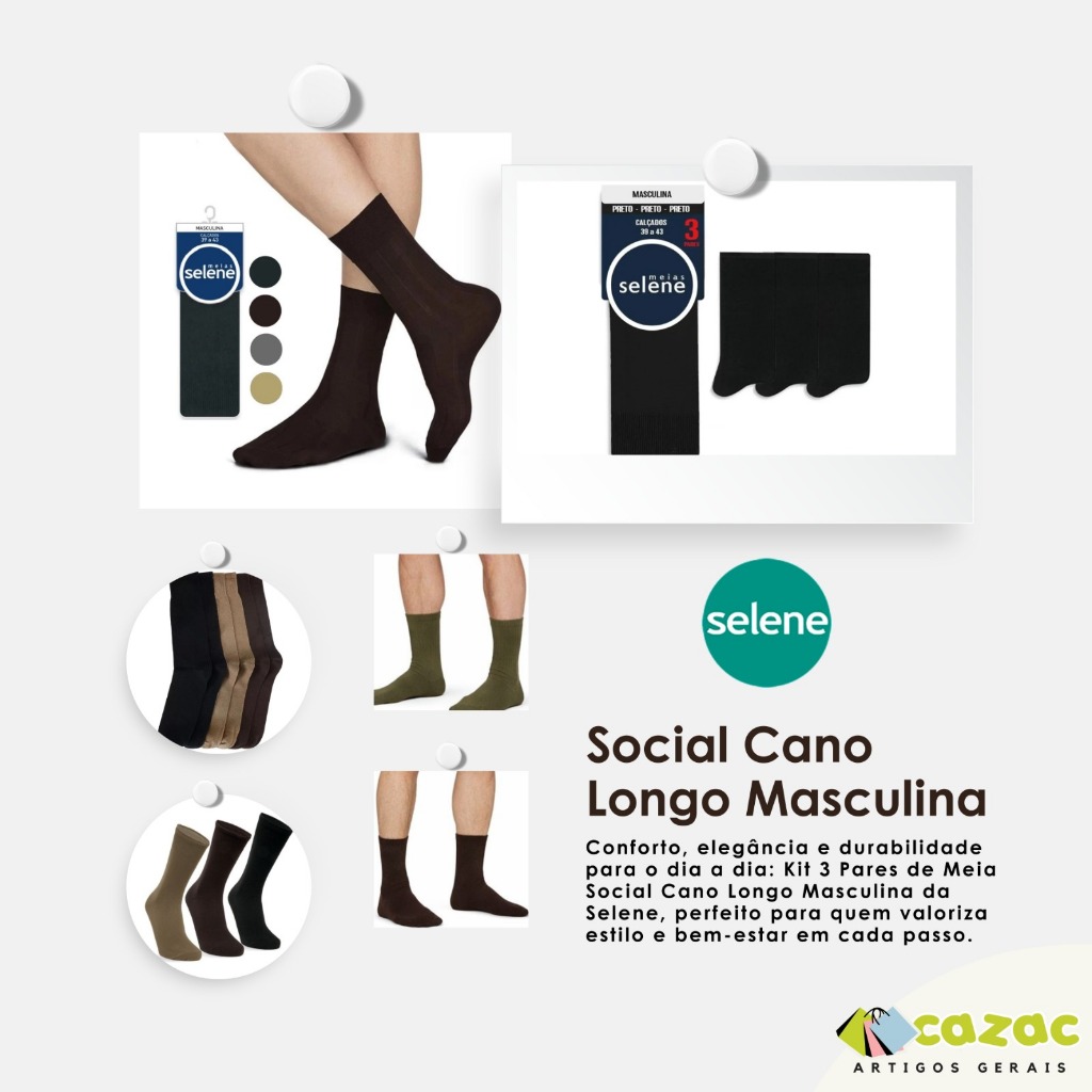 🧦 Kit 3 Pares Meia Selene Cano Longo Masculina – Conforto e Qualidade Original Garanta conforto e durabilidade no dia a dia com o Kit de Meias Selene Cano Longo Masculina. Produzidas em algodão de alta qualidade, são ideais para quem busca maciez, resistência e ajuste perfeito para todas as ocasiões. Perfeitas para uso diário, trabalho ou momentos casuais, as meias Selene oferecem respirabilidade e conforto prolongado, mantendo os pés secos e protegidos ao longo do dia. ✨ Destaques do Produto: ✔ Produto original Selene ✔ Tecido em algodão macio e confortável ✔ Cano longo tradicional masculino ✔ Excelente ajuste aos pés ✔ Alta durabilidade e resistência ✔ Ideal para uso diário 📦 Conteúdo do kit: • 3 pares de meias masculinas cano longo 🎨 Cores disponíveis: • Castor • Café • Preto 📏 Tamanho: • Veste do 38 ao 43 🧵 Composição: Algodão, poliamida e elastano (proporciona conforto, elasticidade e respirabilidade) 💡 Por que escolher Selene? A Selene é referência em qualidade e conforto, oferecendo produtos duráveis e ideais para o dia a dia. Com esse kit, você garante praticidade, economia e muito conforto em um único pedido. 🛒 Adicione ao carrinho e receba meias confortáveis e originais na sua casa!