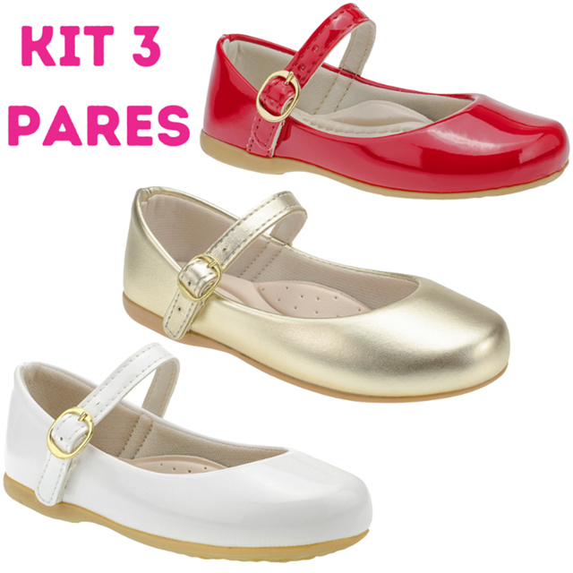 Kit 3 Pares Sapatilha Menina Verniz Metalizado Batizado B2a Kids Dourado Vermelho Branco