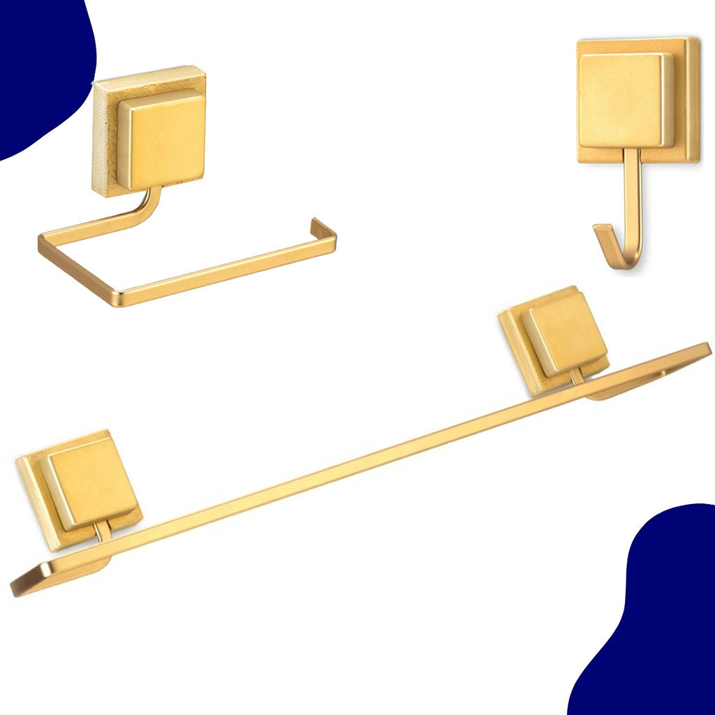 Kit 3 Peças Banheiro Papeleira Gancho Toalheiro De Banho Adesivo 3m Dourado Fixação Dupla Face Arthi