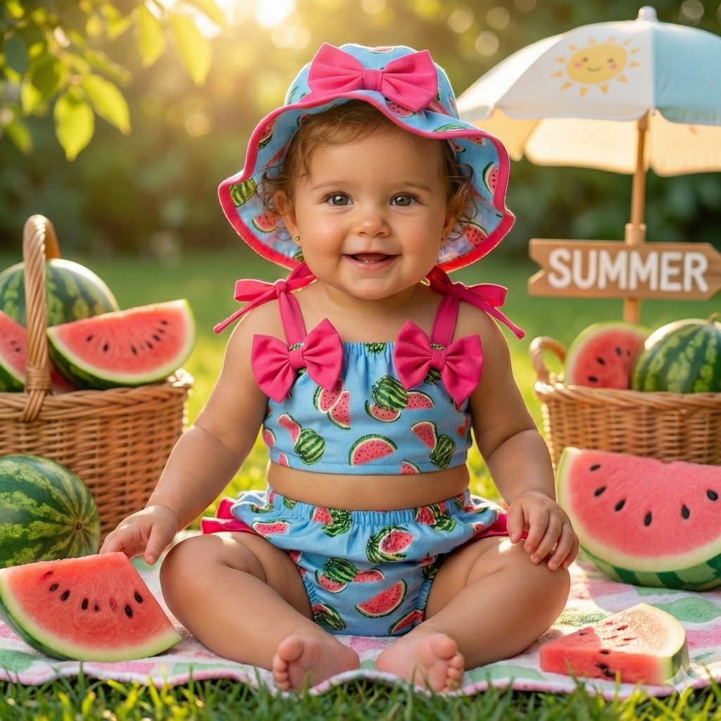 Kit 3 Peças Banho de Sol Bebê Menina Estampa Divertida Charme Laço Delicado Moda Praia Piscina Foto