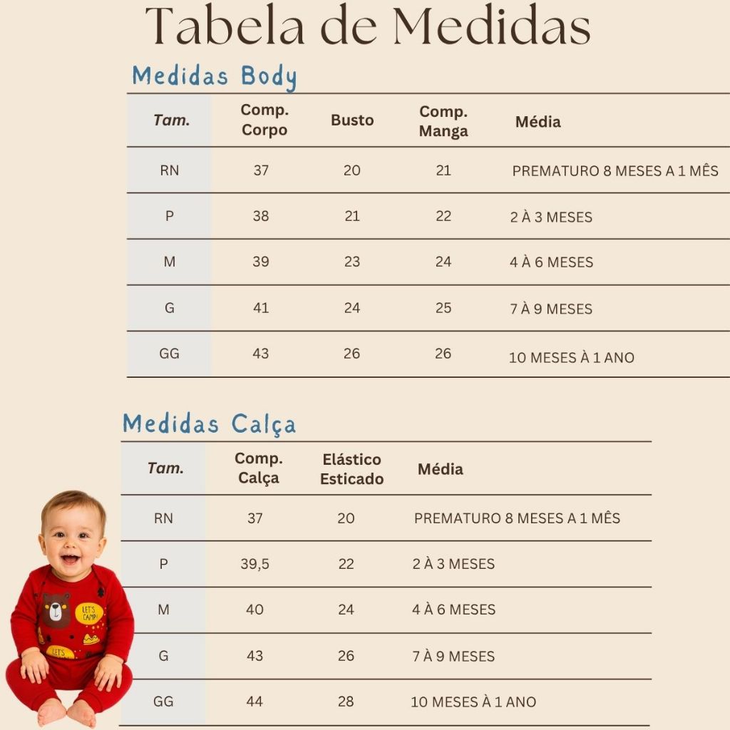 Kit 3 Peças Body Bebê Menino Meia Estação Manga Longa e Curta e Calça Algodão Confortável 🧸 Kit Body Bebê com 3 peças super práticas para o seu pequeno, ideais para inverno! Feitas em Ribana, um tecido macio e elástico, garantindo conforto e flexibilidade para o bebê. Ideal para o enxoval de bebê! Acompanha: 01 body manga longa, 01 body manga curta e uma calça. Escolha a estampa desejada e boas compras :) 🔹 Características do Produto: Body e calça perfeitos para bebê menino Confeccionado em Ribana 100% algodão, com toque suave Disponível nos tamanhos RN, P, M, G, GG – do recém-nascido ao 10-12 meses Ideal para o inverno, mantendo o bebê quentinho e confortável Costura reforçada e botões de pressão resistentes, facilitando as trocas diárias Tecido de qualidade, ideal para a pele sensível do bebê 🔸 Tabela de Medidas (Kit Body Bebê) Body: RN: Comprimento 35cm | Busto 18cm | Manga 19cm (Prematuro 8 meses a 1,5 mês) P: Comprimento 38cm | Busto 19cm | Manga 20cm (2 a 3 meses) M: Comprimento 39cm | Busto 20cm | Manga 22cm (4 a 6 meses) G: Comprimento 42cm | Busto 22cm | Manga 23cm (7 a 9 meses) GG: Comprimento 46cm | Busto 25cm | Manga 25cm (10 a 12 meses) Calça: RN: Comprimento 35cm | Cintura 16cm (Prematuro 8 meses a 1,5 mês) P: Comprimento 36cm | Cintura 17cm (2 a 3 meses) M: Comprimento 38cm | Cintura 18cm (4 a 6 meses) G: Comprimento 40cm | Cintura 19cm (7 a 9 meses) GG: Comprimento 43cm | Cintura 20cm (10 a 12 meses) ⚠️ Atenção: O kit será enviado conforme a sua escolha. Não será enviado sortido. 💬 Ficou com alguma dúvida? Entre em contato com a gente através do CHAT. Estamos prontos para te ajudar com muito carinho! 🥰 🚚 Compre mais modelos da nossa loja e receba tudo junto. O envio é imediato! 🧡 Equipe Básico mais Criativo 🧡