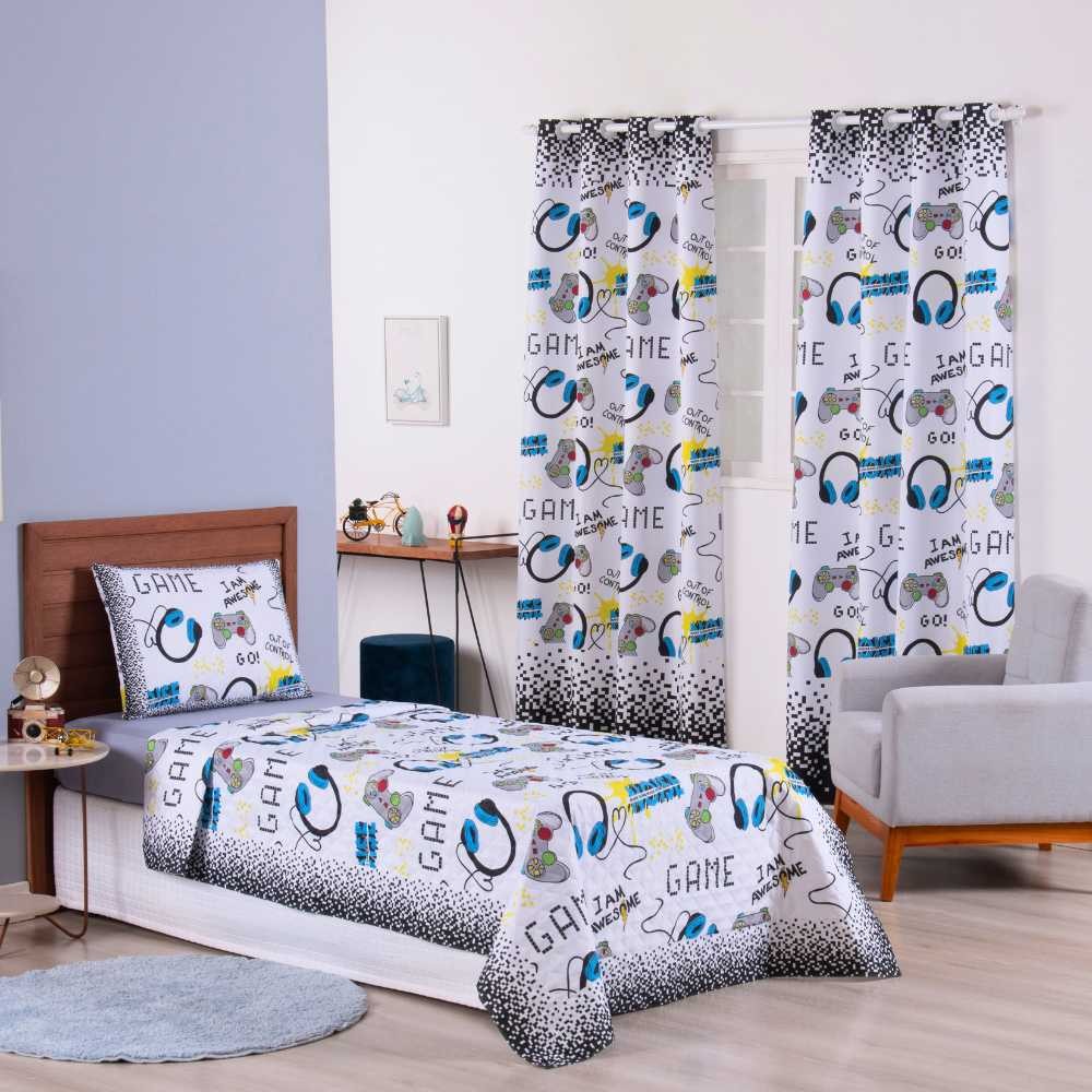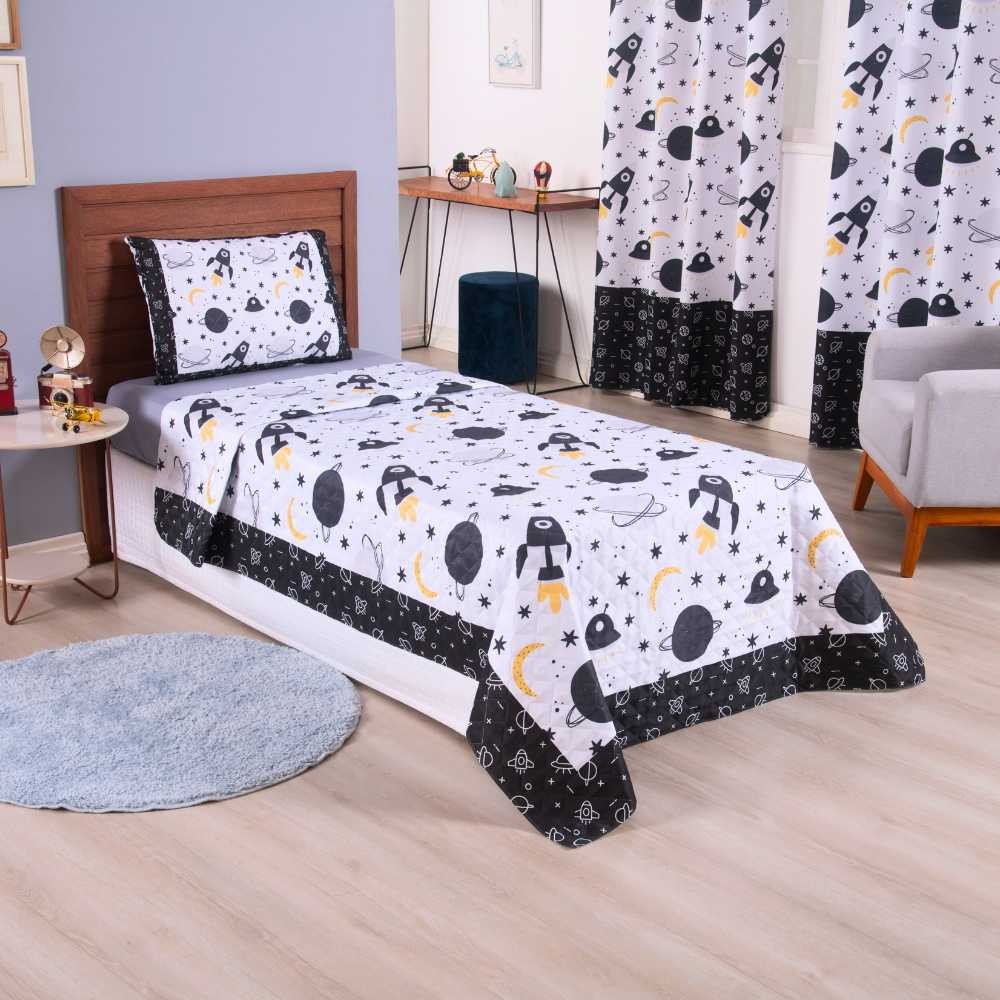Kit 3 Peças Colcha e Cortina 3,00cmX2,20cm Infantil Futebol/Princesa/Bombeiro - Menina/Menino/Baby