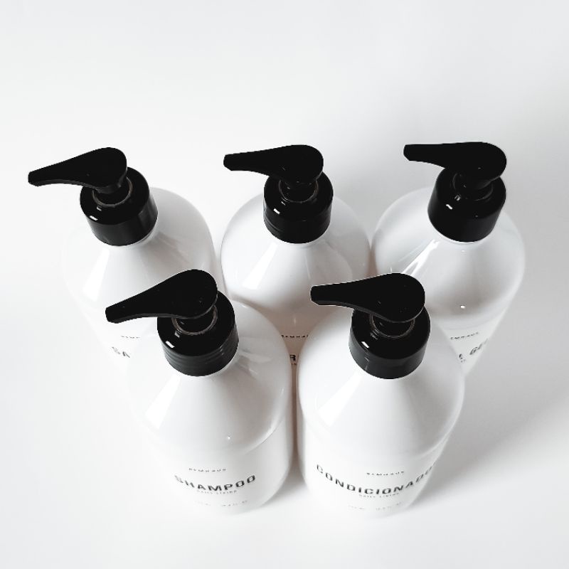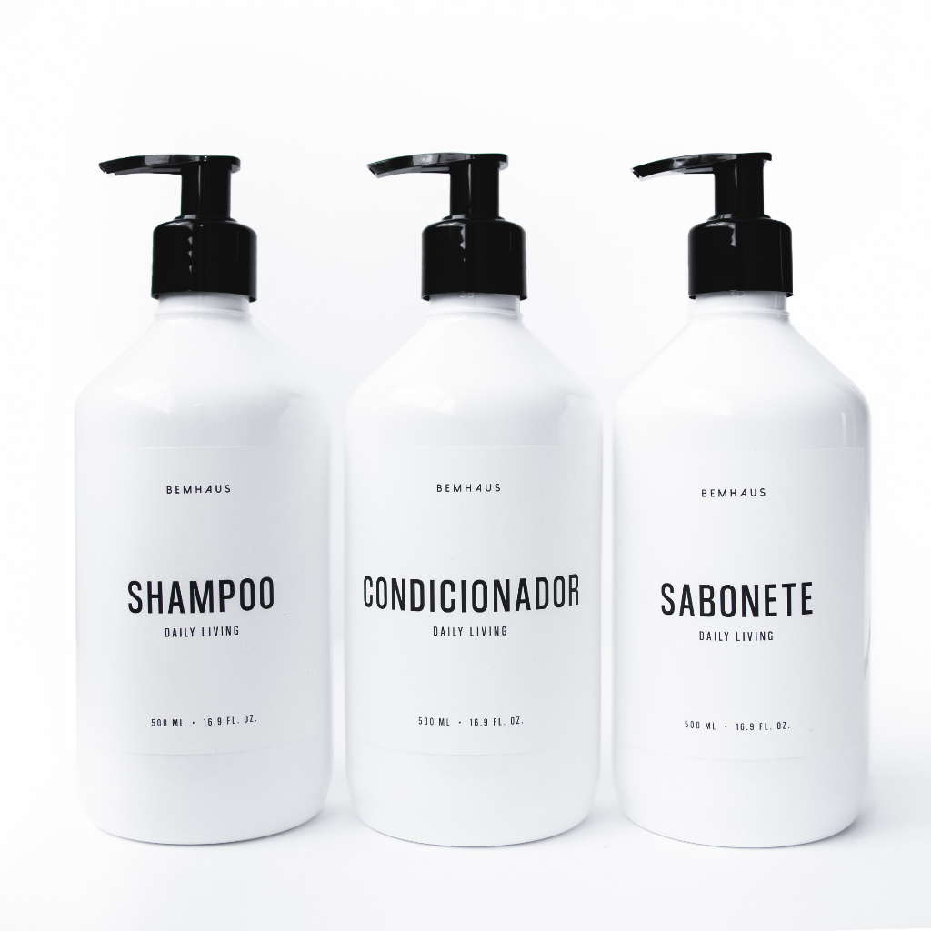 Conjunto de 3 frascos brancos SHAMPOO + CONDICIONADOR + SABONETE - 500 ml + 3 válvulas pump pretas. Observações: - Medida de cada frasco: 19,5 cm x 7cm - Etiqueta com acabamento fosco que suporta contato com a água - Capacidade 500 ml - Frascos vazios - Material: Plástico Caso tenha dúvidas sobre o produto, entre em contato conosco. Abraços, BEMHAUS
