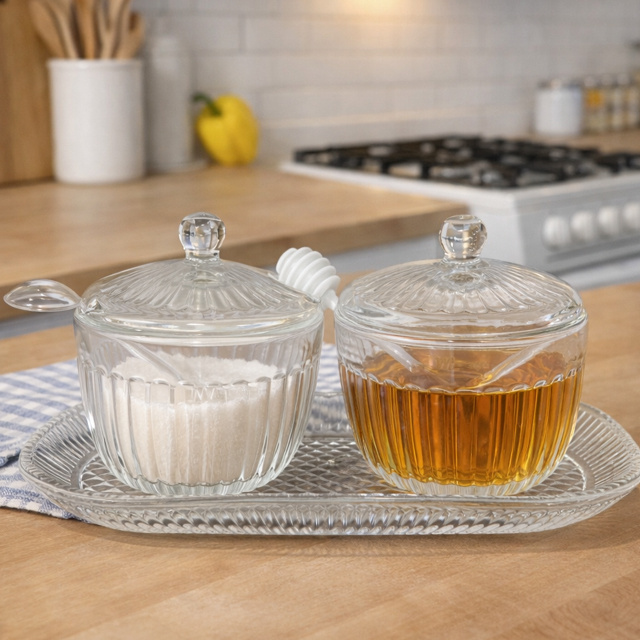 Kit 3 Peças Meleira 240ml + Açucareiro 240ml + Bandeja de Vidro Cristal