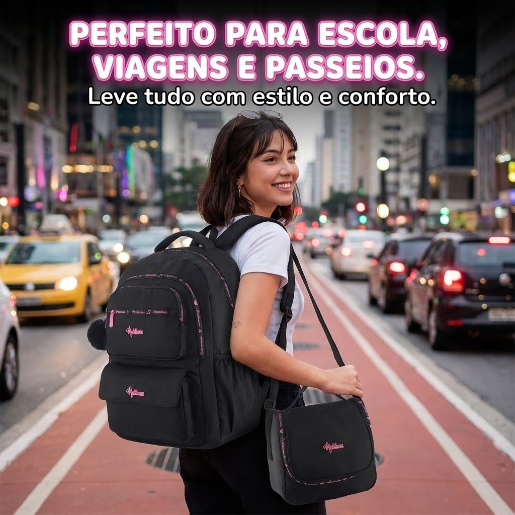 Kit 3 Peças Mochila Lancheira Termica Estojo Escolar Feminina Grande Reforçada Impermeável Com Divisória Notebook Com 4 Bolsos Zíper E Porta Garrafa Escola Faculdade Viagem Premium Tippi A mochila escolar premium feminina grande foi desenvolvida para acompanhar a rotina de escola, faculdade, trabalho e viagens com conforto e organização. Produzida em material resistente e impermeável, ajuda a proteger os pertences contra respingos e o desgaste do uso diário. Conta com acabamento matelassê e pingente decorativo de miçangas, além de divisória interna para notebook de até 15,6". Possui 4 bolsos grandes com zíper e 2 bolsos laterais para garrafa ou squeeze, facilitando a separação de cadernos, livros, estojo e acessórios. As costas são totalmente acolchoadas com desenho anatômico em formato de coração, e as alças largas, acolchoadas e ajustáveis garantem melhor ajuste. Com zíperes reforçados e costuras resistentes, oferece excelente espaço interno e praticidade no dia a dia. Especificações Técnicas: • Material: Impermeável • Fechamento: Zíper • Bolsos: 04 bolsos grandes com zíper; • Bolsos laterais porta garrafa/squeeze • Costas totalmente acolchoadas (anatômica em formato de coração) • Alças: Largas, acolchoadas e ajustáveis • Reforços: Zíperes reforçados e costuras resistentes • Ocasião indicada: Escolar | Faculdade | Passeios | Viagens | Trabalho Dimensões: • Altura: 43 cm • Largura: 30 cm • Profundidade: 15 cm FAQ (Perguntas Frequentes): 01. Cabe notebook? Sim. Possui divisória interna para notebook de até 15,6". 02. A mochila é impermeável? Sim. O anúncio informa material impermeável, indicado para proteger contra respingos no dia a dia. 03. Quantos bolsos ela tem? São 04 bolsos grandes com zíper e mais 02 bolsos laterais para garrafa ou squeeze. 04. É confortável para usar por longos períodos? Sim. As costas são acolchoadas e anatômicas, e as alças são largas, acolchoadas e ajustáveis. Conteúdo da Embalagem: • 01 Mochila Escolar Feminina Premium • 01 Lancheira (térmica) • 01 Estojo Importante: Valor Unitário Imagens Meramente Ilustrativas Não nos responsabilizamos pelo mau uso do produto