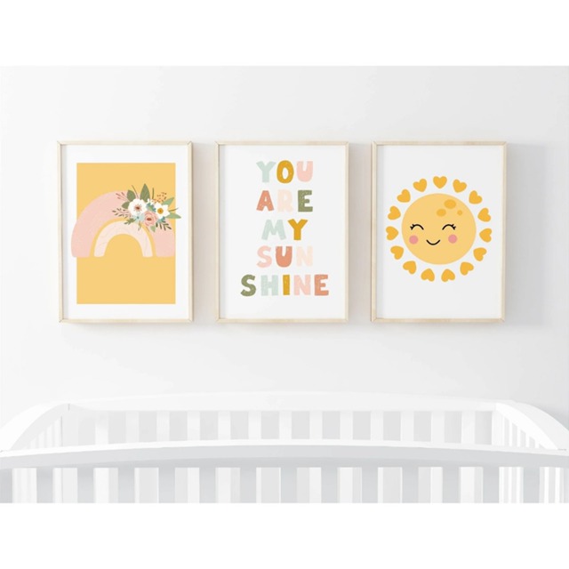 Kit 3 Peças Quadros Decorativos 20x30 MDF Arco-Íris Sol Frase You Are My Sunshine Infantil Decoração Casa Hall