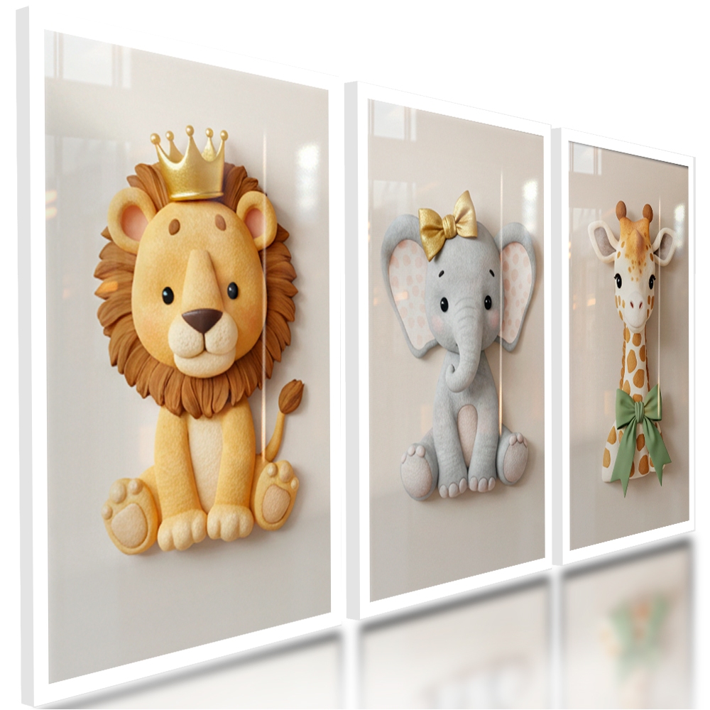 Kit 3 Peças Quadros Infantil Bebê Safari Elefantinho Leãozinho Girafinha Fofos Quarto