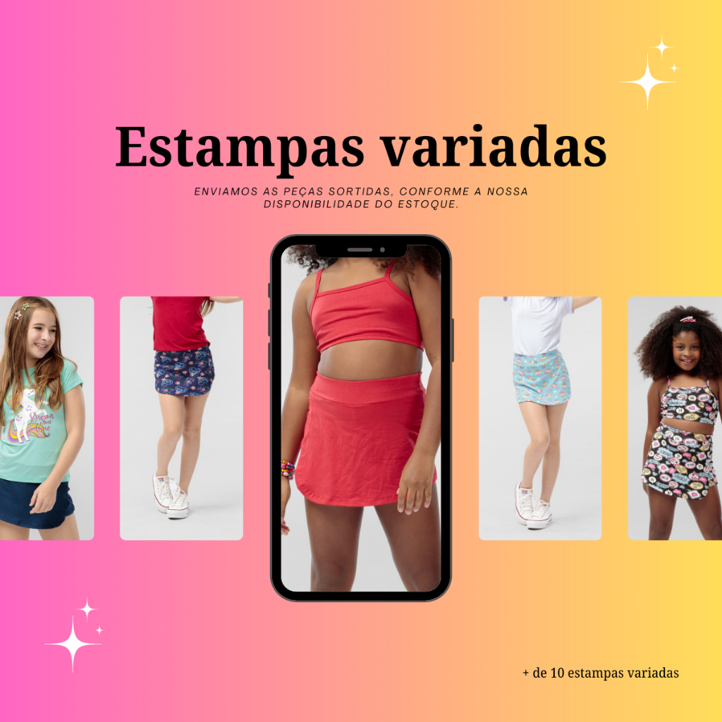 O Kit com 3 Shorts Saia Infantil é confeccionado em malha de cotton de excelente qualidade, proporcionando conforto, segurança e liberdade de movimento. Ideal para o uso diário, não é transparente e possui ótimo acabamento, pensado especialmente para o bem-estar das crianças. O QUE VOCÊ IRÁ RECEBER? 01 Kit contendo 03 Shorts Saia Infantil Modelos sortidos, podendo ser lisos e/ou estampados Todas as peças no mesmo tamanho escolhido BENEFÍCIOS CONFORTO PARA O DIA A DIA MATERIAL MACIO E RESISTENTE NÃO TRANSPARENTE EXCELENTE ACABAMENTO CARACTERÍSTICAS Material: Cotton Modelagem confortável Ideal para uso diário Envio de cores e estampas sortidas TABELA DE MEDIDAS 04 – Cós: 23 cm | Largura: 35 cm | Altura: 23 cm 06 – Cós: 25 cm | Largura: 36 cm | Altura: 25 cm 08 – Cós: 27 cm | Largura: 37 cm | Altura: 27 cm 10 – Cós: 28 cm | Largura: 38 cm | Altura: 28 cm 12 – Cós: 29 cm | Largura: 39 cm | Altura: 29 cm 14 – Cós: 30 cm | Largura: 40 cm | Altura: 30 cm 16 – Cós: 32 cm | Largura: 41 cm | Altura: 32 cm Medidas podem variar levemente por se tratar de produto confeccionado em malha. PERGUNTAS FREQUENTES As cores e estampas podem ser escolhidas? Não. O envio é realizado de forma sortida entre peças lisas e estampadas. As três peças vêm no mesmo tamanho? Sim, todas as peças do kit são enviadas no tamanho selecionado no ato da compra. O tecido é transparente? Não. O material possui ótima gramatura, garantindo segurança e conforto. É indicado para qual ocasião? Ideal para o uso diário, escola, passeios e momentos de lazer. palavras-chave: algodão, cotton, infantil, juvenil, kit short saia, shorts saia feminino, menina, criança