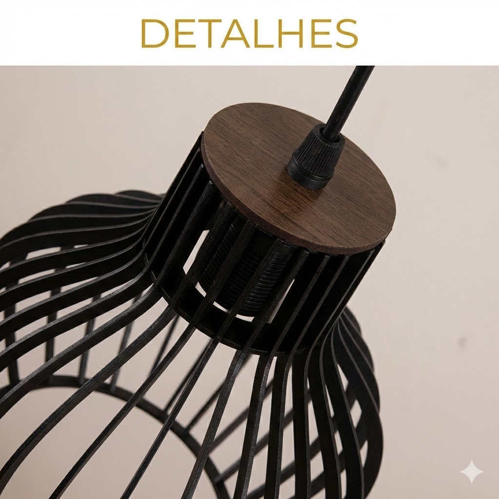 Descrição do produto ********** ATENÇÃO ********** O PRODUTO É ENVIDO MONTADO ! ___________________________________ Para dar aquela inovada na decoração é preciso muita criatividade e bom gosto e isso vem sempre aliada a uma linda Pendente Luminária. Pensando nisso, desenvolvemos e criamos este modelo lindo e exclusivo modelo. Ela é feita com material de primeira qualidade, e seu recorte é todo feito a laser, para se adaptar a qualquer ambiente, seja ele interno ou externo. Ficha Técnica: Cor: Preto Medidas: Diâmetro: 18,5 cm / Altura 21 cm Lugares de montagem: Teto Materiais: Madeira MDF Alimentação: Bivolt 110v / 220v Potência: 100 W Ambientes: Exterior e Interior Capacidade de lâmpadas: 1 Tipos de fontes de luz: LED, INCANDESCENTE, FLUORESCENTE, BULBO, FILAMENTO Tipo de soquete: E27