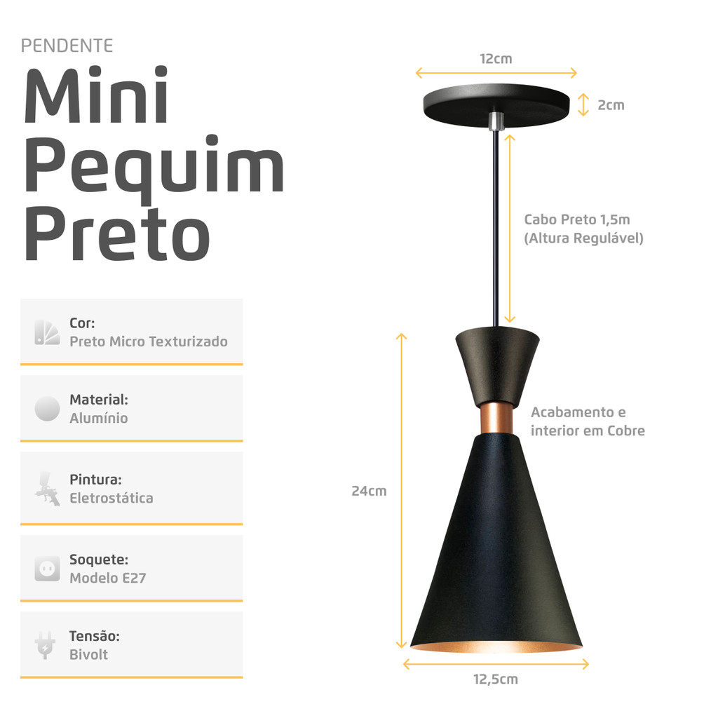 CONTEÚDO DO ANÚNCIO: - 03 Lustre Luminária de Teto Pendente Mini Pequim Preto - NÃO ACOMPANHA LÂMPADA _________________________ Lustre Pendente Mini Pequim Preto e Cobre – Design Moderno e Sofisticação para Ambientes Únicos! Ilumine seu espaço com elegância e um toque industrial contemporâneo! O Lustre Pendente Mini Pequim Preto é perfeito para quem busca modernidade, praticidade e alto padrão na decoração. Ideal para: - Cozinhas (iluminação sobre bancadas ou ilhas). - Salas de jantar e estar (destaque sobre mesas e áreas de convívio). - Quartos (cabeceiras ou cantos decorativos). - Ambientes gourmet e áreas externas cobertas. Destaques Exclusivos: - Design Moderno Industrial: Combinação preto e cobre para um contraste sofisticado e versátil. - Eficiência Energética: Soquete E27 compatível com lâmpadas LED (economize até 80% na energia!). - Material Premium: Feito em alumínio com pintura eletrostática, garantindo durabilidade e resistência a oxidação. - Instalação Fácil: Cabo de 1,50m regulável e canopla compacta (12 cm) para adaptação em qualquer ambiente. - Versatilidade: Ajuste a altura conforme sua necessidade e crie efeitos de iluminação aconchegantes ou marcantes. Por que escolher este lustre? Valorize seu imóvel: um pendente moderno eleva o visual de qualquer espaço. Personalização: use lâmpadas LED quentes ou frias para criar diferentes atmosferas. Praticidade: limpeza fácil e manutenção mínima. Transforme seu ambiente com um lustre que une design, funcionalidade e economia! Garanta já o seu e receba em casa com segurança e agilidade! Especificações Técnicas (Ficha Técnica): Material: Alumínio Acabamento: Preto Microtexturizado + detalhe interno em cobre Voltagem: Bivolt (110v/220v) Soquete: 1 x E27 (lâmpada não inclusa) Dimensões: 24cm (altura) x 12,5cm (diâmetro) Cabo: 1,50m regulável Canopla: 12cm de diâmetro