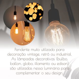 Pendente muito utilizado para decoração vintage, retrô ou industrial. As lâmpadas decorativas (Bulbo, Ballon, Globo, Filamento ou Edison) são utilizadas nessa luminária para complementar o seu design. Em um ambiente, pode se usar vários pendentes desse modelo; instale variando a distância, altura e tipos de lâmpadas para criar um ambiente aconchegante e sofisticado. Especificações: Bocal plástico padrão E27. Canopla em Plastico Cor da Canopla preto Cabo 0.90 (Aceita regulagem) Cor do cabo preto Voltagem: 110/220v (Bivolt) (NÃO acompanha lâmpadas) ----------------------------------------------------------------------------------------------------------------- *Não acompanha parafusos e bucha de fixação no teto, pois depende do tipo de ambiente que será instado, o pendente será enviado como descrito, sem alterações após a compra. ----------------------------------------------------------------------------------------------------------------- Pode ser instalado em vários tipos de tetos: laje, PVC, gesso, ou madeira. ----------------------------------------------------------------------------------------------------------------- *Imagens meramente ilustrativas, podem existir divergência entre as cores reais dos produtos e as cores apresentadas na tela, pois podem variar dependendo da configuração do seu monitor.* ----------------------------------------------------------------------------------------------------------------- Obs.¹: Não nos responsabilizamos pela montagem do produto. Obs.²: Verificar o endereço, a quantidade de peças e especificações, pois não é possível alterá-los após a efetuação da compra, tendo que cancelar a compra (caso não tenha saído para entrega) ou realizar um novo pedido. ----------------------------------------------------------------------------------------------------------------- Estamos à disposição de vocês clientes para responder qualquer dúvida, venha se tornar um de nossos clientes e se surpreender com a qualidade de nossos produtos.