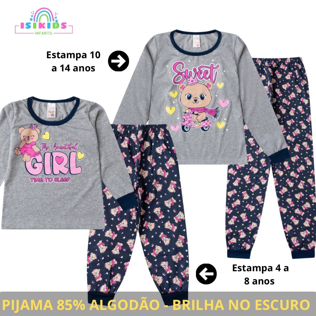 Kit 3 Pijama Infantil Menina Manga Longa Algodão