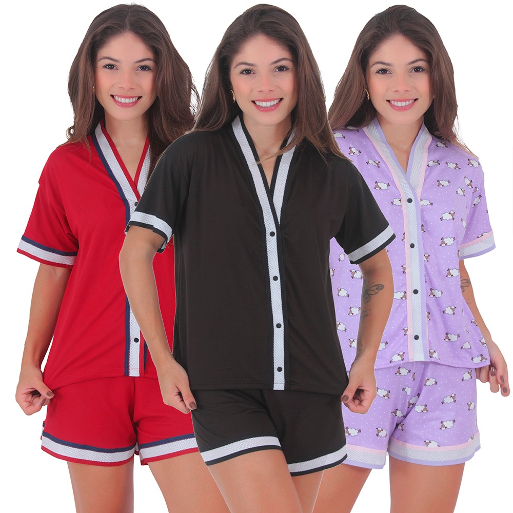Kit 3 Pijamas Americano Suede Fechado Blogueirinha Short Doll Boa Forma