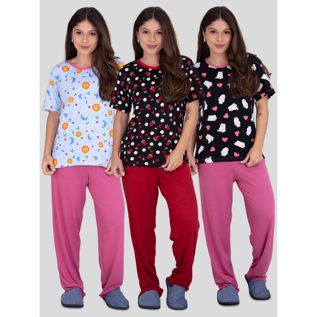Kit 3 Pijamas Feminino Estações Calça Comprida + Camiseta Manga Curta