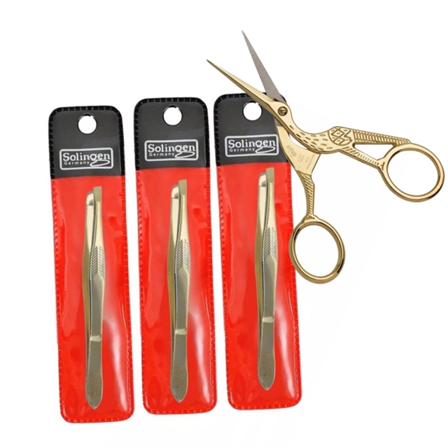 Kit 3 Pinças Chanfrada Solingen + Tesourinha Pássaro - Dourada
