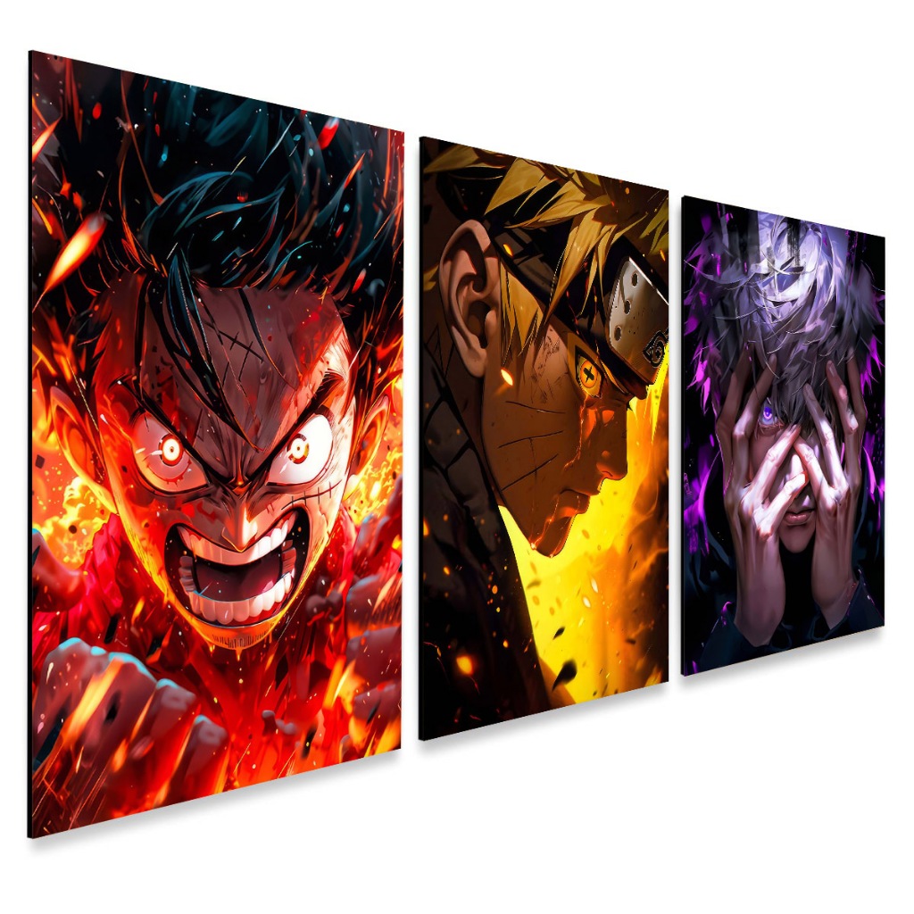 Kit 3 Placas Decorativas Anime Luffy, Satoro Gojo e Naruto