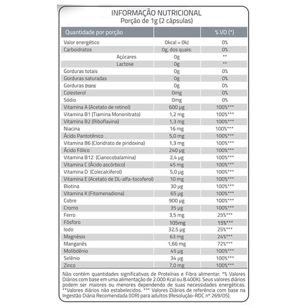 Kit 3 Polivitamínico Sênior Catarinense 60 cápsulas Sênior foi desenvolvido especialmente para adultos com mais de 50 anos, pois ao passar dos anos nosso corpo perde nutrientes importantes que precisam ser repostos de maneira constante. Ingredientes Fosfato de cálcio, Óxido de magnésio, Vitamina C revestida, dl-alfa-acetato de tocoferol, Nicotinamida, Pirofosfato de ferro, Óxido de zinco, Sulfato de manganês, Fitomenadiona, Vitamina A acetato, Pantotenato de cálcio, Vitamina B12, Sulfato de cobre, Vitamina D3, Biotina, Riboflavina, Cloridrato de piridoxina, Molibdato de sódio, Tiamina mononitrato, Selenito de sódio, Iodeto de potássio, Ácido fólico, Picolinato de cromo. Estabilizante: Celulose Microcristalina (INS 460i). Antiumectante: Dióxido de silício (INS 551). Lubrificante: Estearato de magnésio (INS 471iii). Gelificante: gelatina (INS 428). Acidulante: Ácido acético (INS 260). Corantes: Dióxido de titânio (INS 171), Azorubina (INS 122), Azul brilhante (INS 133) e Amarelo quinoleína (INS 104). Ingestão Recomendada Recomenda-se ingerir 2 cápsulas ao dia, que atendem a Ingestão Diária Recomendada (IDR) descrita na tabela de Informação Nutricional. Deve ser ingerido com líquido.
