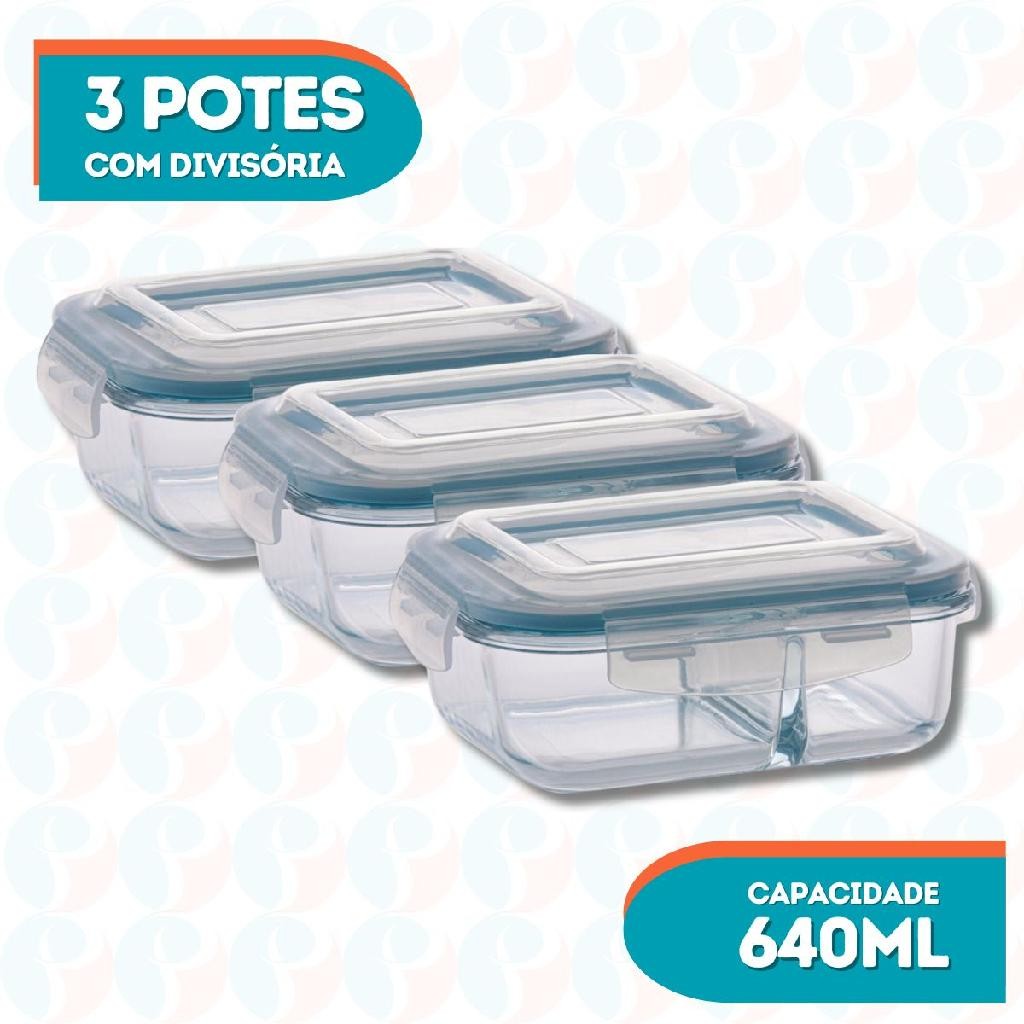 Kit 3 Pote de Vidro Hermético Com Divisoria 640ml Marmita