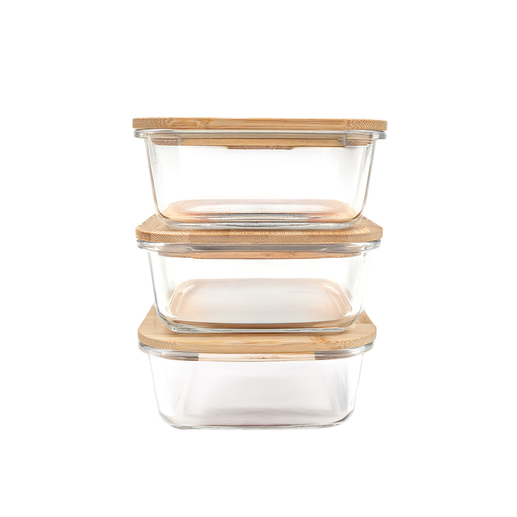 kit 3 potes de vidro 740ml com tampa de bambu hermético marmita quadrados - Tud