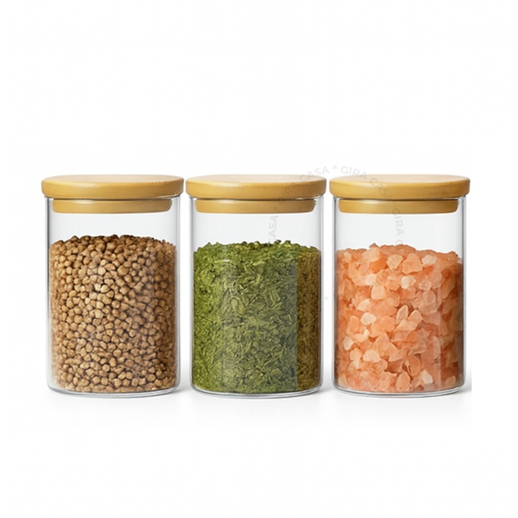 Kit 3 potes de vidro com tampa de bambu herméticos para mantimentos empilháveis
