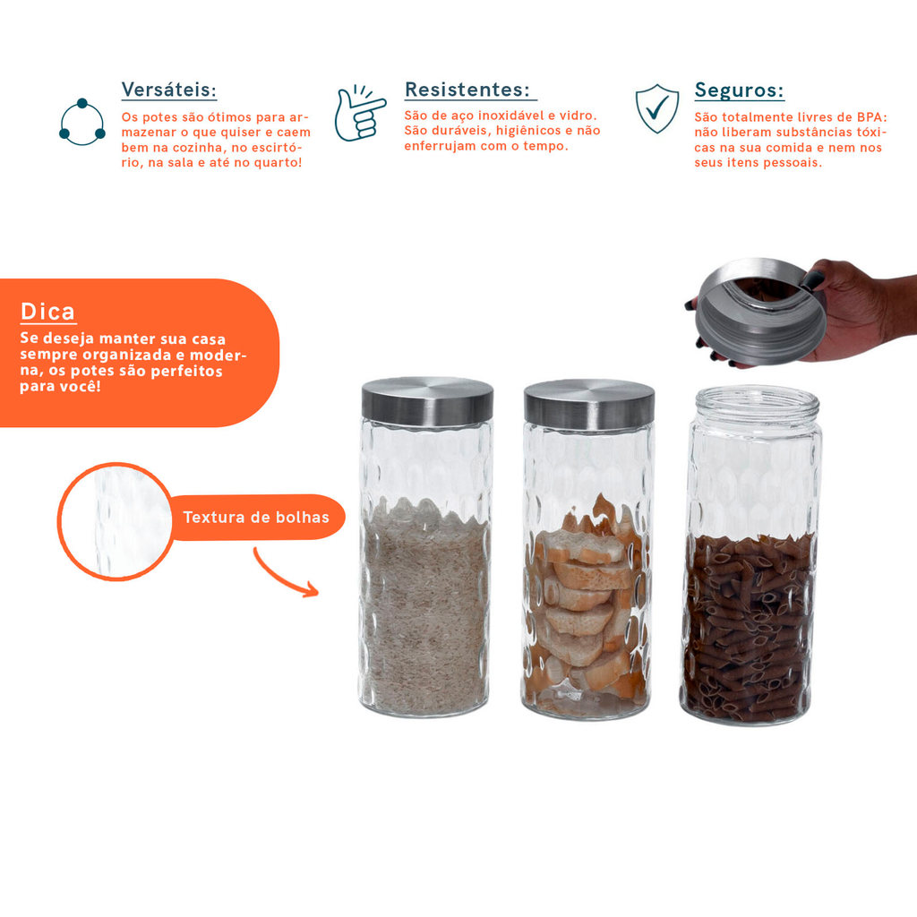 Kit 3 potes de vidro com tampa inox bolhas redondo 2200ml - Mozcada