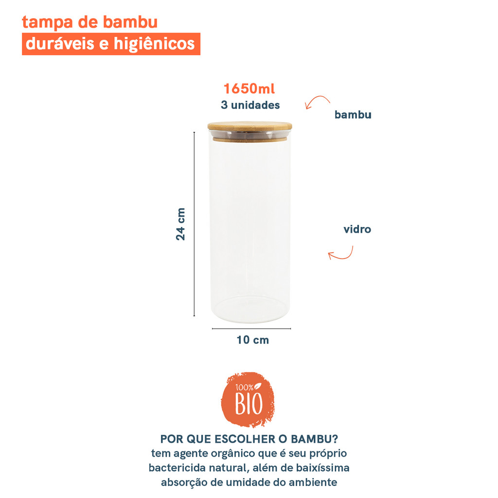 Kit 3 Potes de Vidro P/ Mantimentos 1650ml C/ Tampa Bambu Oikos