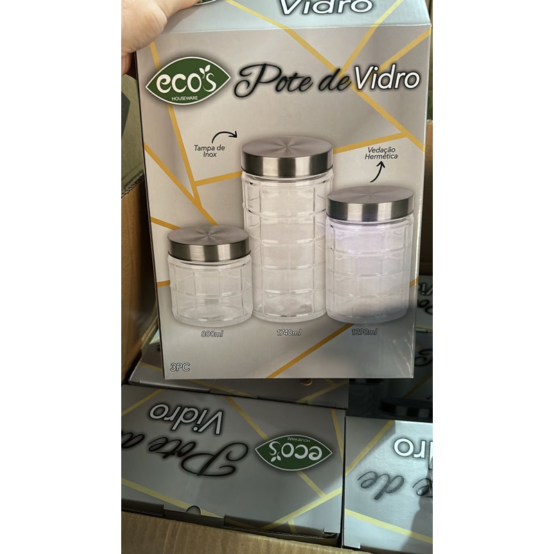 Kit 3 Potes de Vidro para Armazenamento de Mantimentos Vedação Hermética Variações: -Tampa inox -Tampa inox cor de madeira Tamanhos dos potes: -800 ml -1290ml -1740ml