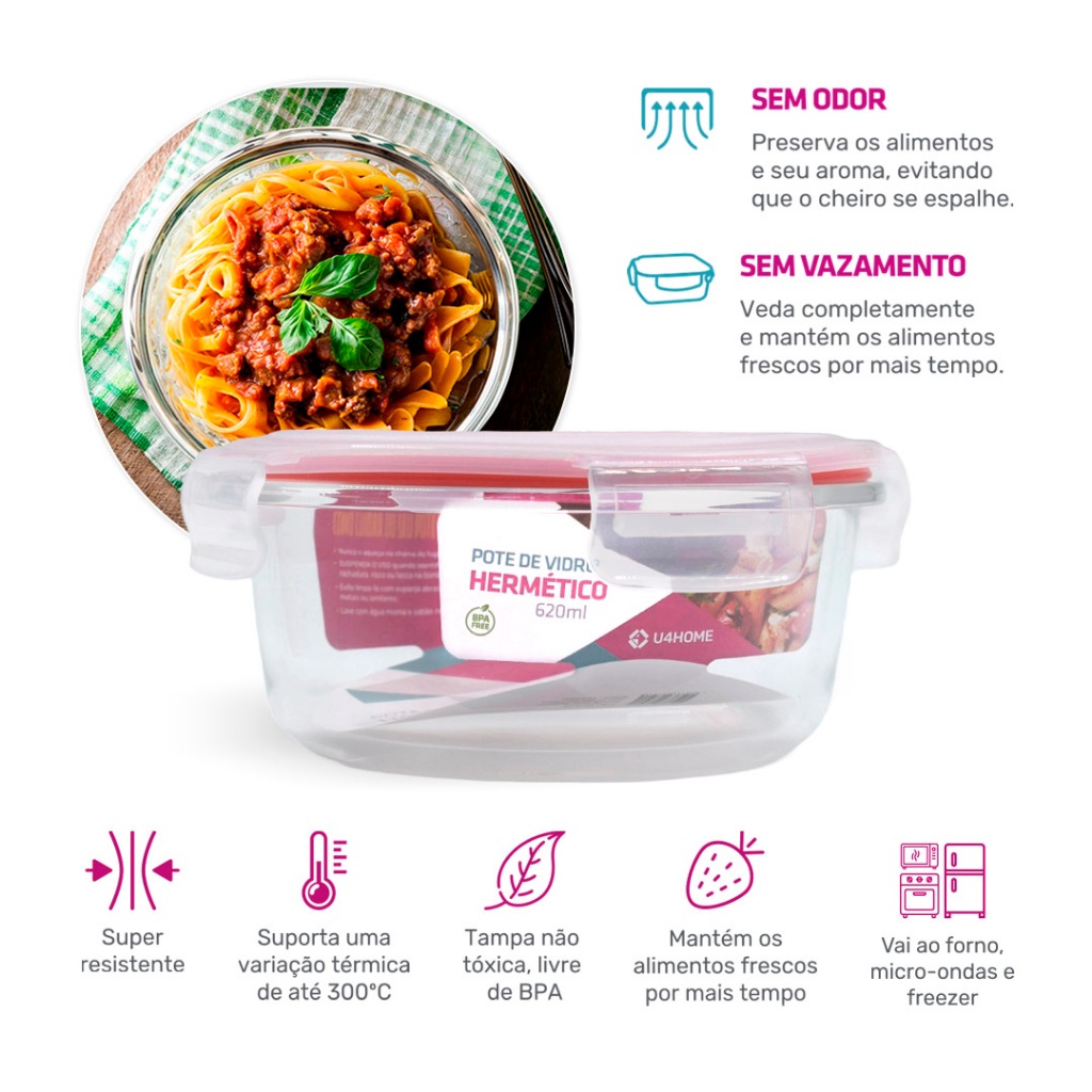 3 un do Pote Hermético de Vidro Redondo 620ml Querendo trocar seus Potes de plástico por um pote de vidro com alta qualidade, resistência, durabilidade e fácil de limpar? Então me acompanhe nessa leitura e surpreenda-se com os Potes de Vidro Hermético U4HOME: Existem muitos malefícios que podem ser causados devido ao uso do plástico para preservar os seus alimentos. Sabia que quando aquecido, ele pode liberar toxinas sobre a sua comida? Isso pode causar doenças graves com o passar do tempo. Sem falar nas manchas de alimentos que ficam no pote de plástico, não é mesmo? Com os Potes de Vidro Hermético, você não estará sujeito à isso. Além de serem muito resistentes, eles também suportam a variação de temperaturas em até 300ºC, podendo ir ao freezer e micro-ondas. São muito fáceis de serem lavados, pois possuem o anel de silicone para vedação removível, não deixa o cheiro se espalhar e sem qualquer risco de vazamento, mantém o pote super vedado! O Pote Hermético de 620ml possui o tamanho ideal para preparar e transportar marmitas. O seu tamanho e design permitem o armazenamento seguro dos alimentos seja no freezer ou geladeira. A nossa equipe é especializada em identificar produtos que aliam qualidade, preço acessível e que de fato, resolvam algum problema. São muitos anos comercializando produtos para sua casa, sabemos como atender suas necessidades com muita dedicação e amor pelo trabalho. =) Aliando qualidade, praticidade e preço justo, apresentamos o Pote de Vidro Hermético. O Pote ideal para o seu dia-a-dia. Diferenciais --- • Anel de silicone removível • Possui 4 super travas • Mantém os alimentos frescos por mais tempo • Suporta uma variação térmica de até 300°C (não é indicado dar choque térmico) • Evita que o cheiro se espalhe devido a sua super vedação • Vai ao forno convencional (sem a tampa), forno elétrico (sem a tampa), microondas (sem a tampa) e freezer • Tampa livre de BPA (Bisfenol A), ou seja, não é tóxica • Fácil de limpar e higienizar, pois pode tirar o anel de silicone e vedação para limpeza • Sem risco de vazamento devido a sua super vedação • Super resistente, Vidro Borosilicato Fique atento a imitações baratas, só os potes U4HOME aliam qualidade com todos os diferenciais mencionados. Ideal para: --- • Preparar e transportar marmitas; • Armazenar os alimentos na geladeira; • Marinar carnes e peixes • Aquecer os alimentos no micro-ondas • Guardar os alimentos no freezer • Presentear a mãe ou a sogra…rs Ficha Técnica --- Modelo: Pote de Vidro Redondo Marca: Nabox Material: Vidro Borosilicato, tampa de plástico e anel vedação de silicone Capacidade: 620ml Tamanho: 14,9x5,9cm Peso: 1,32g Item incluso: 3 Pote Hermético Garantia: 30 dias contra defeito de fabricação
