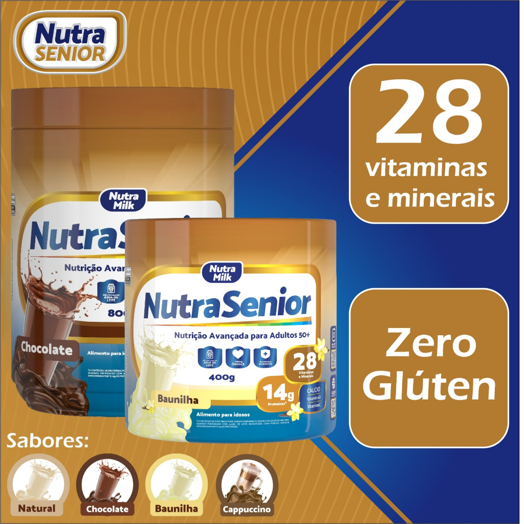 Composição do Anúncio 3 potes de Nutra Senior 50+ Tamanho: 800g ***Comprando esse kit você ganha 1 CANECA EXCLUSIVA NUTRA SENIOR 350ml*** Nutra Senior 50+ é um suplemento nutricional desenvolvido com alta tecnologia pela indústria Alimentícia Nutramilk, visando o equilíbrio nutricional e a melhora da saúde em geral. Desenvolvido especialmente para pessoas acima de 50 anos, Nutra Senior 50+ oferece em sua fórmula 28 ingredientes ricos em vitaminas e minerais e um sabor delicioso. É um suplemento completo para quem busca um suporte para a alimentação equilibrada e saudável. Seu formato em pó facilita a ingestão e sua fórmula foi cuidadosamente elaborada para atender às necessidades específicas dessa faixa etária. Principais características: - Fórmula com 28 Vitaminas e Minerais; - Rico em Vitaminas e Minerais; - Rico em nutrientes essênciais; - Zero Glúten. Principais Nutrientes: VITAMINA e CÁLCIO: Auxiliam para manutençãos dos Ossos mais fortes. FERRO: Auxilia na produção de células vermelhas. VITAMINAS DO COMPLEXO B: Contribuem para produção e liberação de energia. VITAMINA C e ZINCO: Contribuem para o fortalecimento do sistema imunológico. CÁLCIO e Potássio: Fortalecimento dos Ossos e dentes. ZINCO: ajuda na saúde imunológica,na cicatrização e na saúde da pele. MAGNÉSIO: Ajuda na saúde cardiovascular e na regulação do açúcar no sangue. MODO DE USAR: Adicione 1 dosador do Nutra Senior 50+ em 1 copo com 200ml de água (pode ser quente ou gelada). Misture bem até a completa dissolução. INFORMAÇÕES NUTRA SENIOR 50+ - Sabores: Chocolate / Baunilha / Cappuccino / Natural (Sem sabor). - Potes de 400g e 800g. Nutra Senior 50+ Aproveite todos os benefícios que esse suplemento pode oferecer e desfrute de uma vida mais saudável e ativa.