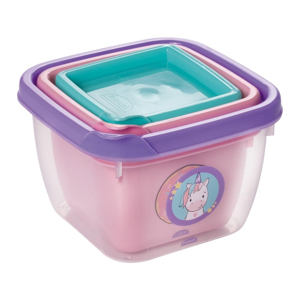 Kit 3 Potes Unicórnio Lancheira Passeio Papinha Plasútil Dimensao: (Comp x Larg x Alt): 11,1x11,1x8,0 cm - O conjunto de potes Conect possui 3 tamanhos que irão facilitar a organização dos alimentos dos pequenos. Para os maiores: lancheira ou bolsas de passeio com frutinhas, pãezinhos, doces, cereais... E para os bebês: papinhas com legumes, carboidratos, proteínas e vegetais devidamente armazenados e proporcionados. - Composto por 3 potes quadrados de: 140 ml, 270 ml e 470 ml. - Fabricado em plástico polipropileno (PP). Atóxico e livre de bisfenol-A (BPA FREE). - Funcionalidade: espaço otimizado em armários e gavetas. 3 potes ocupam apenas o espaço de um, pois tampas e bases se encaixam perfeitamente. - Pode ser levado para o micro-ondas e freezer..