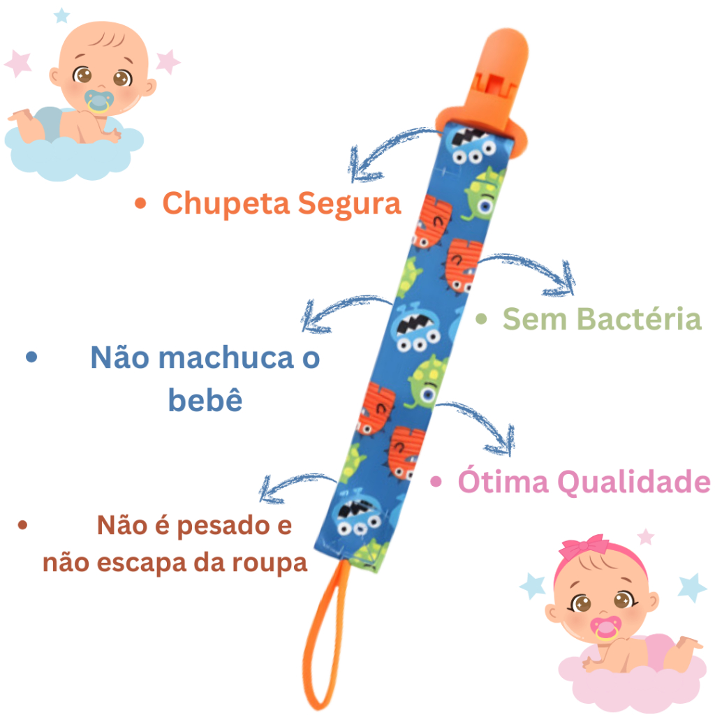 Kit contendo 3 Prendedores para Chupeta + 2 anéis adaptadores para chupeta sem alça O acessório ideal para o seu bebê! Com o nosso prendedor de chupeta, seu bebê terá sempre a chupeta à mão e livre de germes. Feito com materiais de alta qualidade e designs charmosos, este prendedor não é apenas funcional, mas também um acessório de moda que valoriza qualquer look. Diga adeus às chupetas perdidas e olá ao conforto com um toque de elegância! Adquira hoje mesmo o seu e desfrute de um produto que alia segurança, estilo e comodidade! OBS: Os anéis são de silicone transparente Tamanho: 28 cm Largura: 2,5cm PRODUTO COM NF E ENVIO EM 24HRS