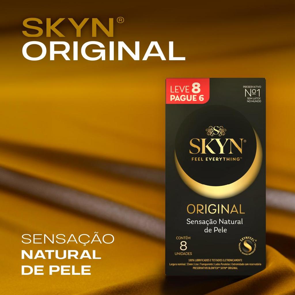 Kit contém 3 Preservativos Skyn Original Leve 8 Pague 6 unidades SKYN Original Conheça SKYN SKYN é a marca de preservativos n 1 sem látex no mundo. Desenvolvidos com a exclusiva tecnologia SKYNFEELTM, os preservativos SKYN® são ultrafinos e ultramacios, oferecendo a sensação mais próxima de usar nada durante a intimidade. SKYN é especialista em intimidade e acredita que a jornada para o prazer é infinita. Por esse motivo, SKYN oferece uma linha completa de preservativos para todos os gostos além das tradicionais SKYN Original e SKYN Elite, a marca conta com opções saborizadas SKYN Sexy Cherry sabor Cereja e SKYN Cocktail inspirada nos coquetéis mais famosos do mundo: Passion Daiquiri, Cherry Sunrise e Piña Colada, e com benefícios diferenciados, como SKYN Texturizado, SKYN Extra Lubrificado com lubrificação extra, SKYN Extra Grande mais larga, para maior conforto e SKYN Selection pack sortido com os melhores SKYN. Para que serve SKYN Os preservativos SKYN ORIGINAL destinam-se a recobrir o pênis ereto durante a relação sexual, auxiliando na prevenção de doenças sexualmente transmissíveis, no planejamento familiar e para usuários que apresentam alergia ao látex de borracha natural. Características Produto SKYN Original Marca SKYN Disponível em versões com 03 e 06 unidades, além da versão promocional Leve 8 Pague 6 unidades Largura Nominal 53mm Liso, transparente, lados paralelos e extremidade com reservatório Material poliisopreno tecnologia SKYNFEELTM 100 lubrificados e testados eletronicamente Composição poliisopreno sintético e óleo de silicone lubrificante Como usar os preservativos SKYN Antes do ato sexual 01. Abra o envelope só na hora do uso, de maneira delicada para evitar qualquer danificação. 02. Segure a ponta do preservativo entre o polegar e o dedo indicador contra a ponta do pênis ereto e aperte a ponta do preservativo para liberar o excesso de ar no interior da extremidade. Nunca o desenrole antes de usar. 03. Com a outra mão desenrole o preservativo em toda a extensão do pênis. Como o esperma pode ser liberado antes da ejaculação, o preservativo deve ser colocado no pênis antes de qualquer contato do pênis com a vagina. Se o preservativo for desenrolado ao contrário, ele não descerá até a base do pênis. Se isso acontecer, jogue-o fora e abra outro. Após o ato sexual Após o ato sexual, retire o pênis antes de perder a ereção, segurando o preservativo na base, para evitar vazamento do esperma. Remova o preservativo, enrole-o em papel e jogue-o no lixo, não jogue o preservativo no vaso sanitário. Use um novo preservativo para cada ato sexual. Precauções e Advertências Produto de uso único. Abra o envelope somente na hora do uso. Não fracione a embalagem. Use um novo preservativo para cada relação sexual e cada tipo de prática sexual vaginal, oral, anal. Caso o coito seja prolongado, recomenda-se a substituição do preservativo. Ocorrendo irritação em qualquer dos parceiros, o uso deverá ser descontinuado. Persistindo os sintomas, consulte um médico. Se desejar utilizar um lubrificante adicional, recomenda-se usar um lubrificante à base de água. Não utilize lubrificante à base oleosa tais como óleo mineral, cremes ou vaselina nos preservativos, pois isso pode danificá-lo. Checar o preservativo no caso que este esteja muito escorregadio ou apertado no pênis, devido ao risco de ruptura. Procurar atendimento médico imediatamente, ao menos dentro de 72h, no caso de vazamento ou ruptura do preservativo durante o uso. Descartar o preservativo caso a embalagem esteja danificada e utilizar um novo. Eficácia Embora nenhum método contraceptivo possa garantir 100 de eficácia, os preservativos, quando usados corretamente, são um meio extremamente eficaz de prevenção da gravidez, sem os efeitos colaterais por vezes associados a outros métodos. Os preservativos são destinados para uso em relações sexuais vaginais e anais; outros usos podem aumentar o potencial de ruptura. Os preservativos, quando usados corretamente, também podem ajudar a reduzir o risco de propagação da infecção por HIV AIDS e muitas outras doenças sexualmente transmissíveis DST. Armazenamento Guarde à temperatura ambiente. Proteja preservativos contra períodos prolongados de exposição a temperaturas extremas baixas ou altas, umidade, luz direta do sol e luz fluorescente para não comprometer a sua integridade. Se o preservativo estiver pegajoso, quebradiço ou com aparência danificada, não o utilize.