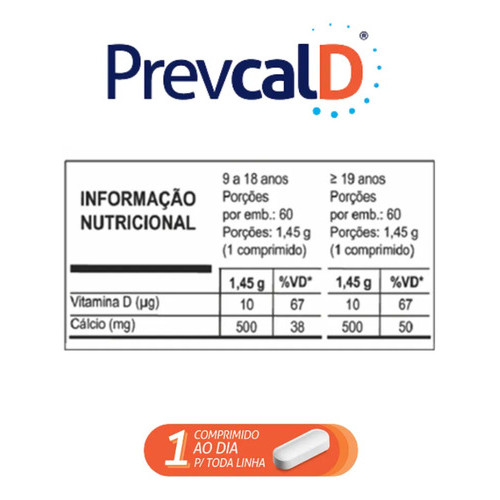 Kit Prevcal D Massime – Cálcio 500mg + Vitamina D 400UI – 180 Comprimidos O Prevcal D é um suplemento alimentar desenvolvido para contribuir com a saúde óssea e a manutenção de níveis adequados de cálcio e vitamina D no organismo. Cada comprimido fornece 500mg de cálcio elemental e 400UI de colecalciferol (vitamina D3), combinação essencial para fortalecer ossos e dentes, prevenir a osteoporose e melhorar a absorção de cálcio. Conteúdo: 3 caixas com 60 comprimidos revestidos cada Modo de uso: Ingerir 1 comprimido ao dia, ou conforme orientação profissional. *Este produto é um suplemento dietético, não é um medicamento. Suplementa Ante dietas insuficientes. Consulte seu médico e / ou farmacêutico. Produto dispensado de registro conforme RDC 27/2010.