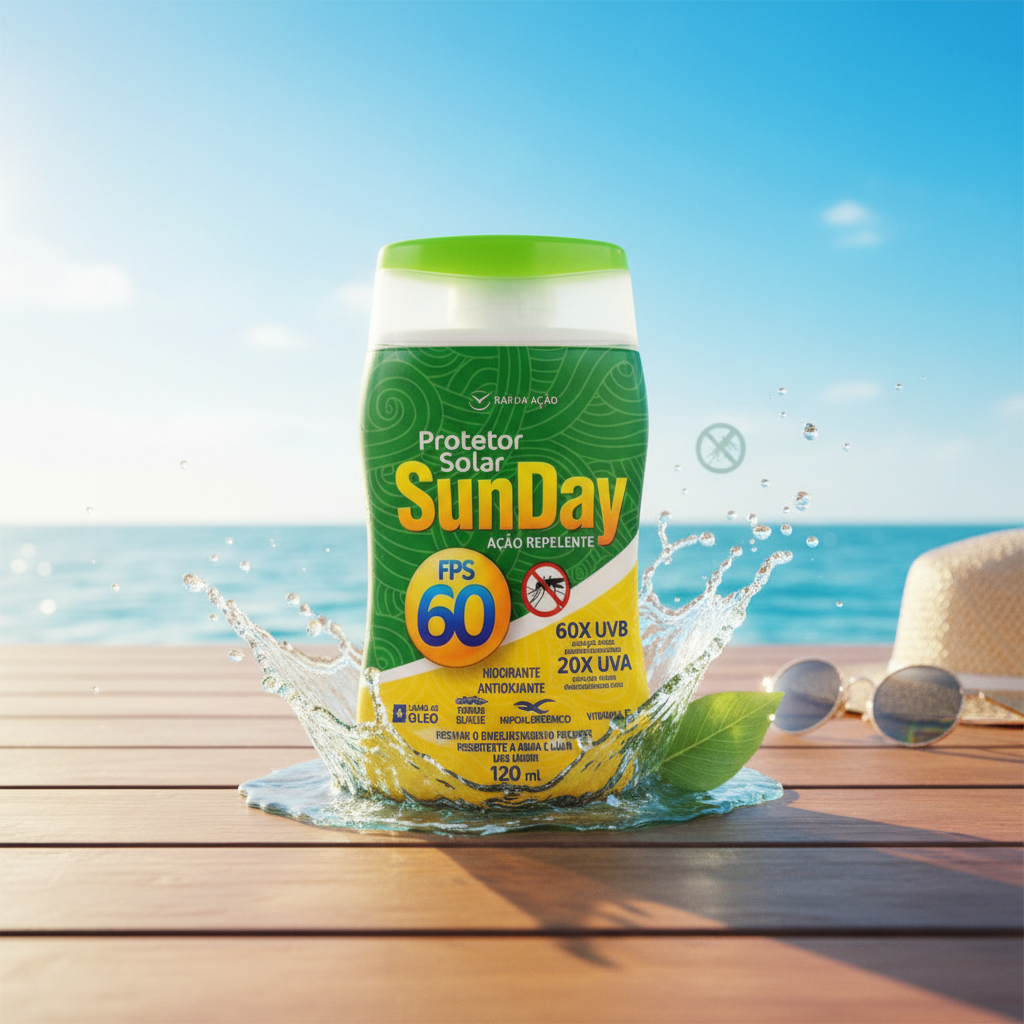 Sunday FPS 60 – Protetor Solar com Ação Repelente {Proteção completa contra o sol e os insetos no dia a dia} O Sunday Protetor Solar FPS 60 Ação Repelente 120ml foi desenvolvido para quem busca proteção solar avançada aliada à ação repelente, ideal para atividades ao ar livre, praia, piscina e rotina urbana. Sua fórmula oferece alta proteção contra os raios UVA e UVB, ajudando a prevenir os danos causados pela exposição solar. Além disso, contribui para a prevenção do envelhecimento precoce da pele, mantendo o cuidado diário com conforto e segurança. Dupla proteção: sol + insetos Com FPS 60, o produto auxilia na proteção eficaz contra os raios solares, enquanto sua ação repelente ajuda a afastar insetos, trazendo mais tranquilidade para o uso diário, especialmente em ambientes externos. Sua textura leve, toque suave e livre de óleo proporciona rápida absorção, sem deixar a pele oleosa ou pegajosa. Principais Benefícios • FPS 60 – alta proteção UVA e UVB • Ação repelente • Ajuda a prevenir o envelhecimento precoce • Resistente à água e ao suor • Livre de óleo – toque seco • Textura leve e rápida absorção • Contém Vitamina E • Hipoalergênico • Testado dermatologicamente • Embalagem de 120ml