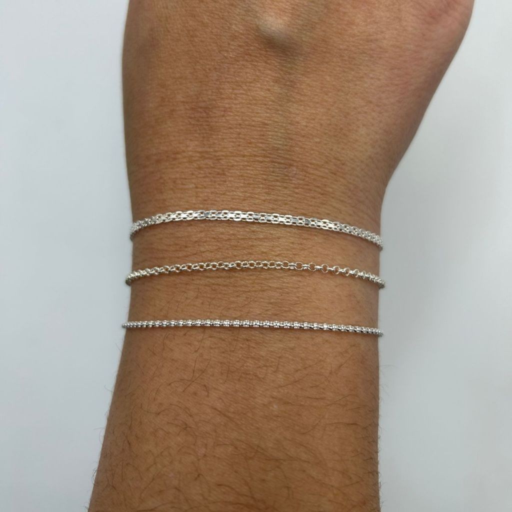 Kit 3 Pulseiras Feminina de Prata 925 Bismark Elo Português e Pipoca Diamantada